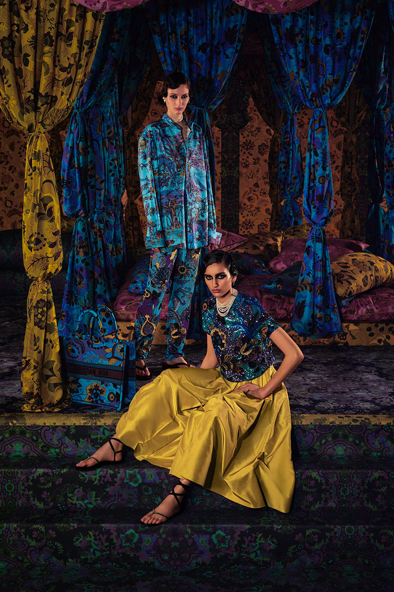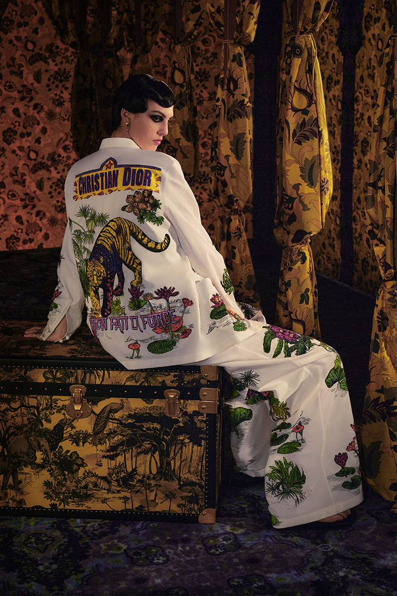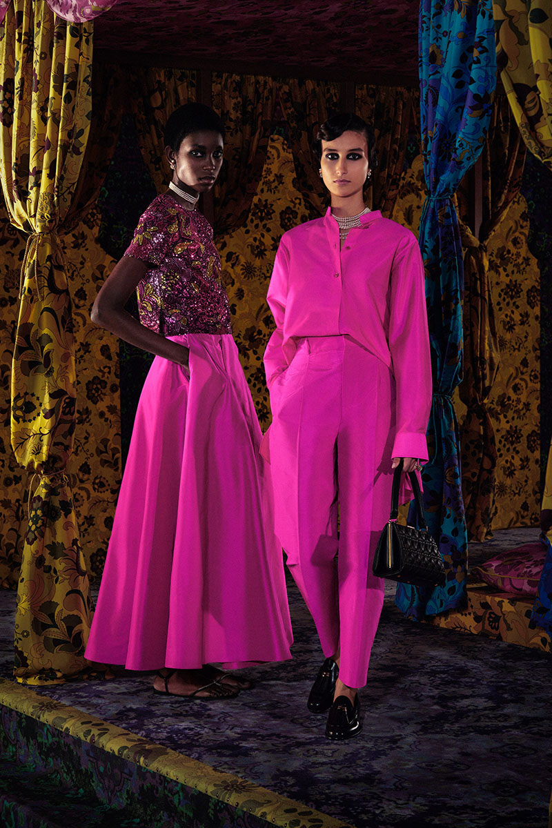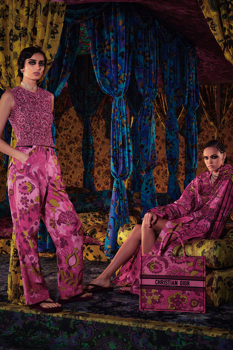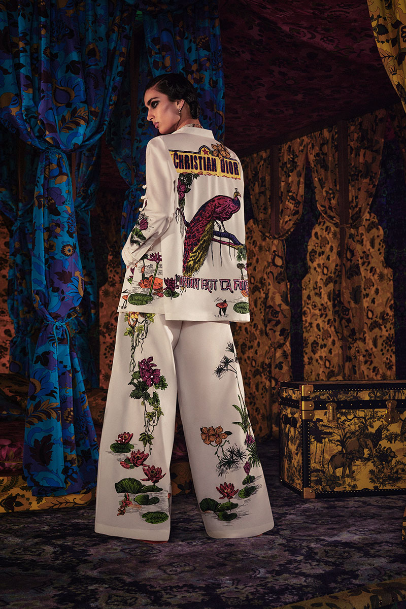 Las formas geométricas enmarcan las lentejuelas doradas y plateadas y el strass. También se introducen motivos decorativos con un caleidoscópico conjunto de colores y el toile de Jouy se ve realzado por elementos del paisaje indio. El motivo floral “Jardin Indien” creado especialmente para la colección de Dior Fall 23 se estampa en la seda de pijamas, camisas y vestidos.