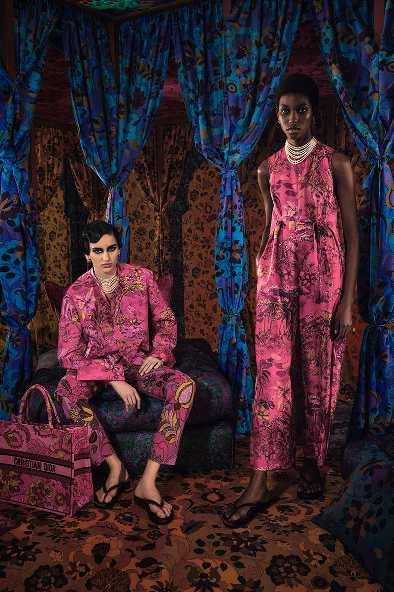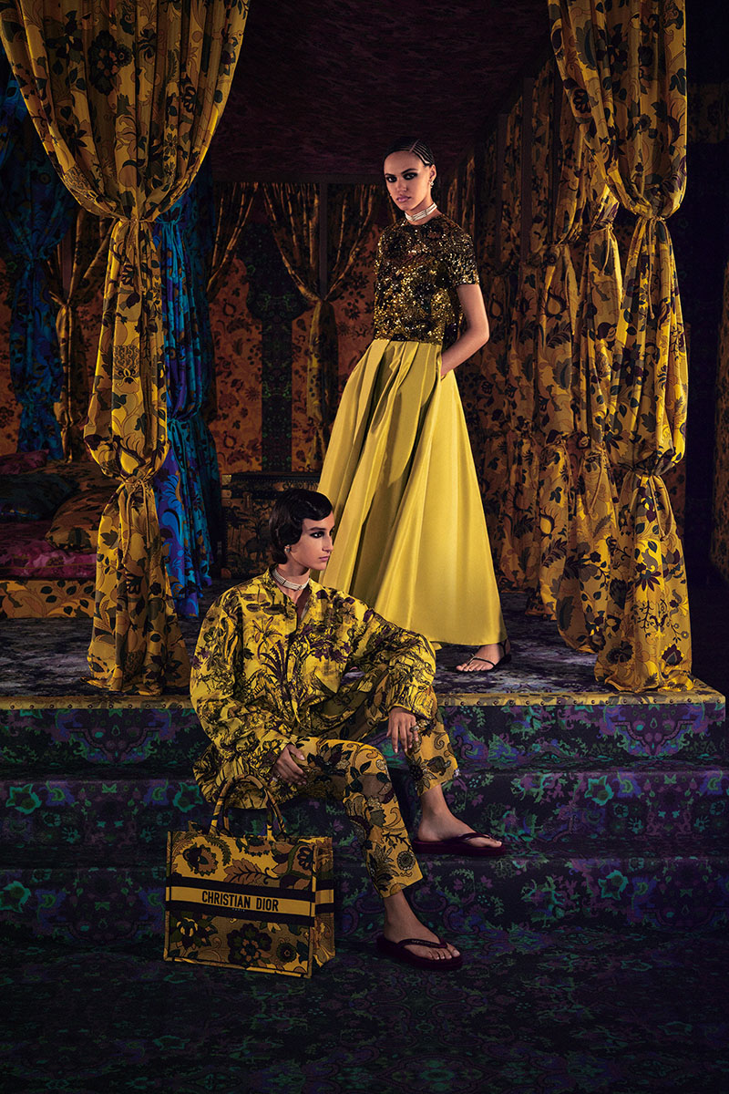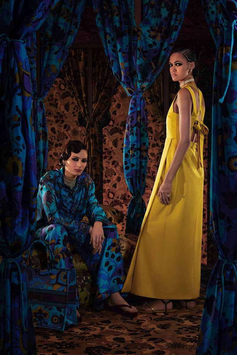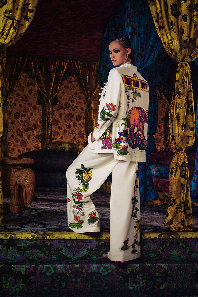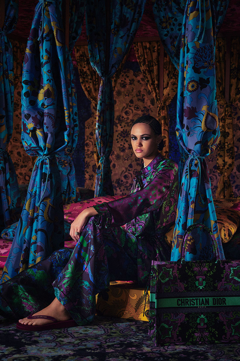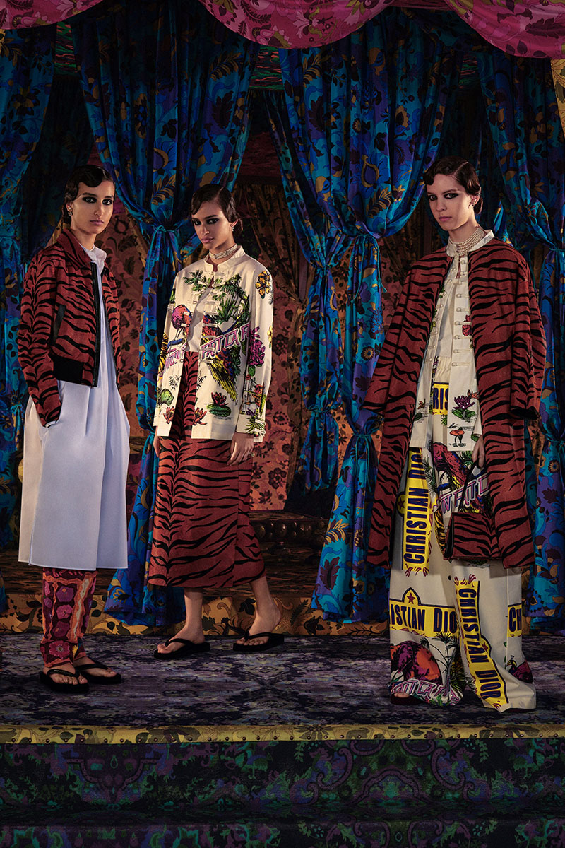 Las formas geométricas enmarcan las lentejuelas doradas y plateadas y el strass. También se introducen motivos decorativos con un caleidoscópico conjunto de colores y el toile de Jouy se ve realzado por elementos del paisaje indio. El motivo floral “Jardin Indien” creado especialmente para la colección de Dior Fall 23 se estampa en la seda de pijamas, camisas y vestidos.