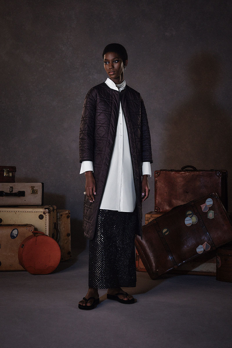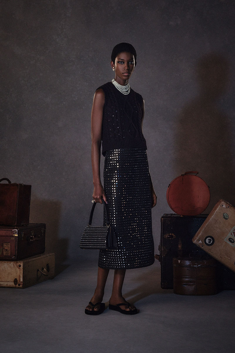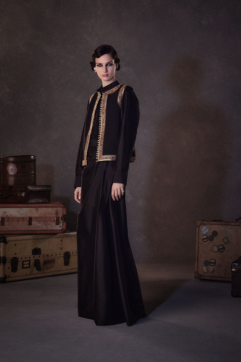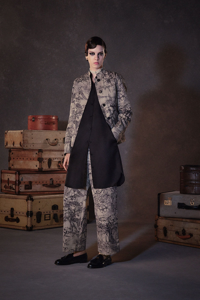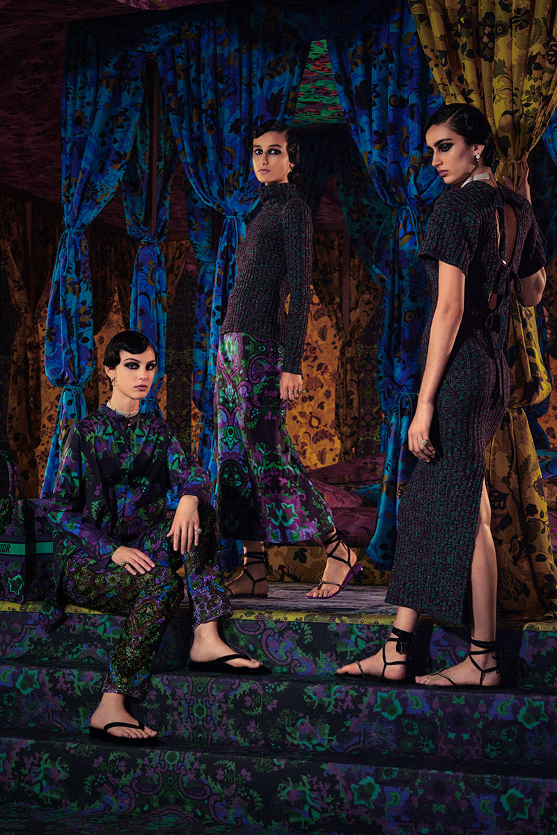 Las formas geométricas enmarcan las lentejuelas doradas y plateadas y el strass. También se introducen motivos decorativos con un caleidoscópico conjunto de colores y el toile de Jouy se ve realzado por elementos del paisaje indio. El motivo floral “Jardin Indien” creado especialmente para la colección de Dior Fall 23 se estampa en la seda de pijamas, camisas y vestidos.