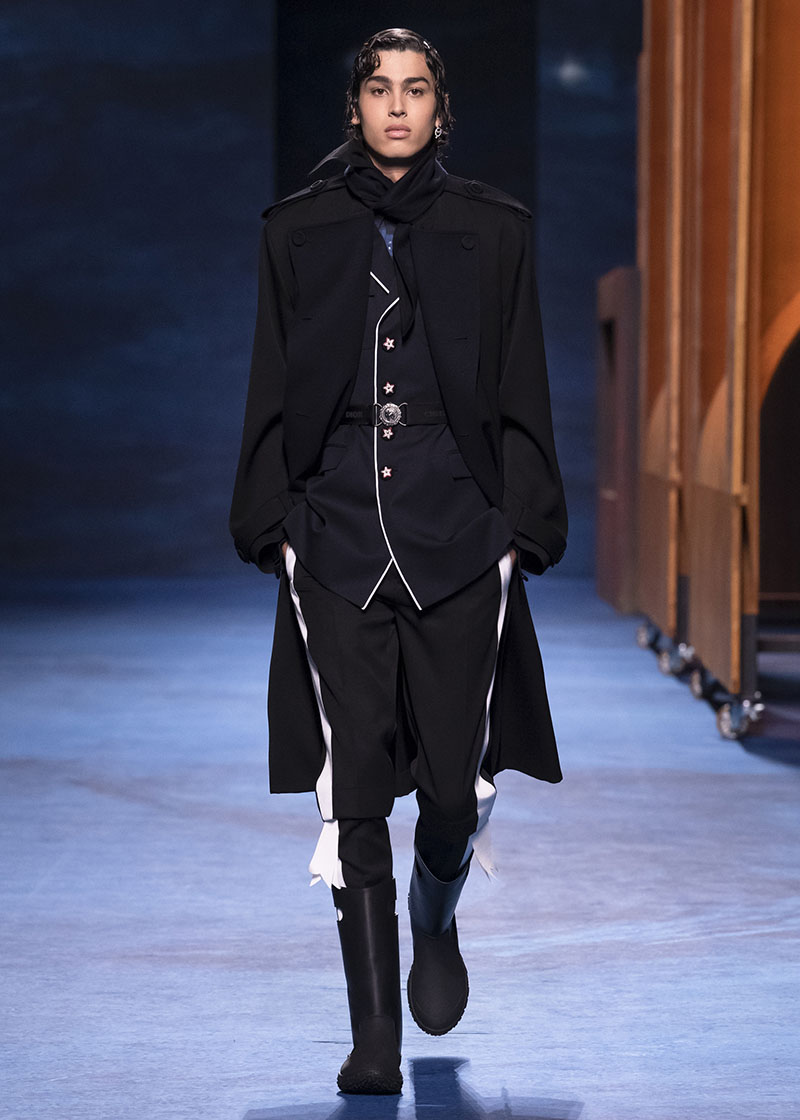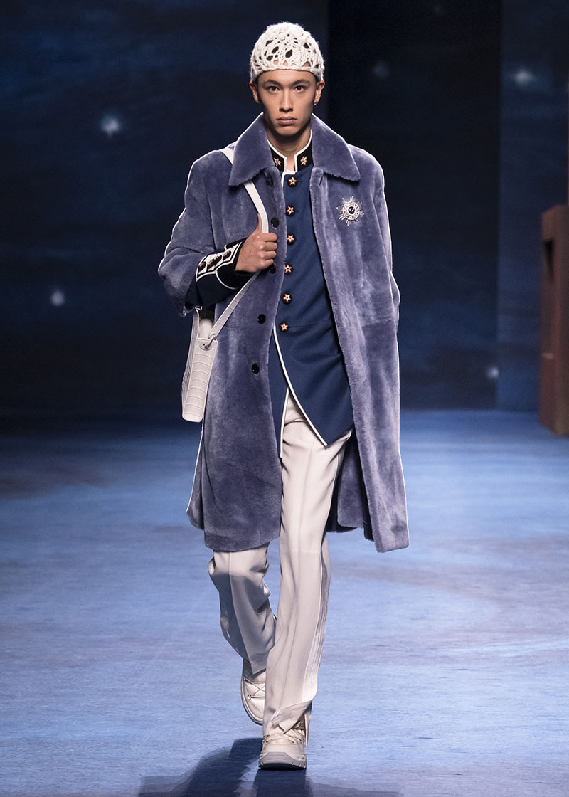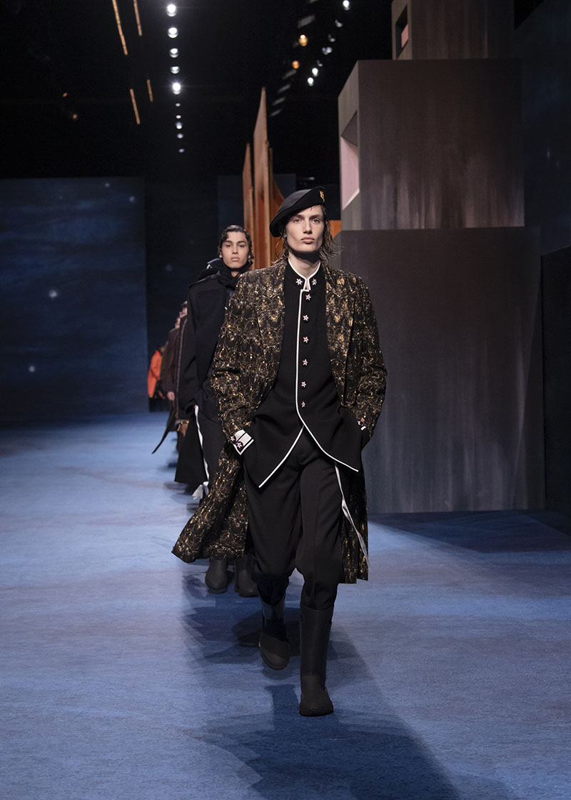 La alta costura de la maison Dior estuvo en todo momento presente a través de las prendas de la nueva colección de Dior Men’s FW21. La elegancia sigue intacta pero con una apariencia más relajada gracias a las transformaciones de Kim y a los dibujos de Doig. A los bordados y el tejido de jacquard se superponían lienzos en blanco con alguna de las obras más icónicas del pintor contemporáneo.