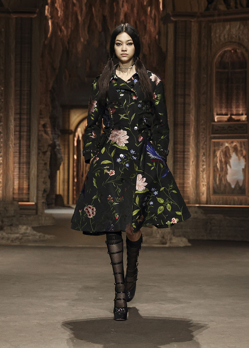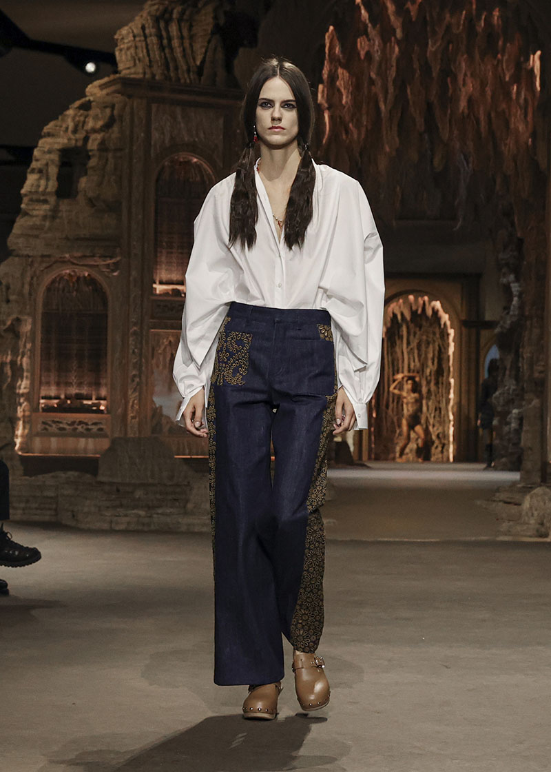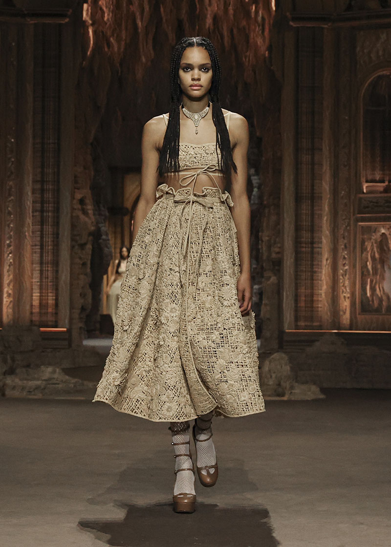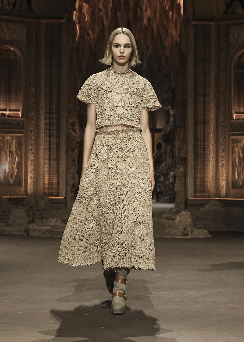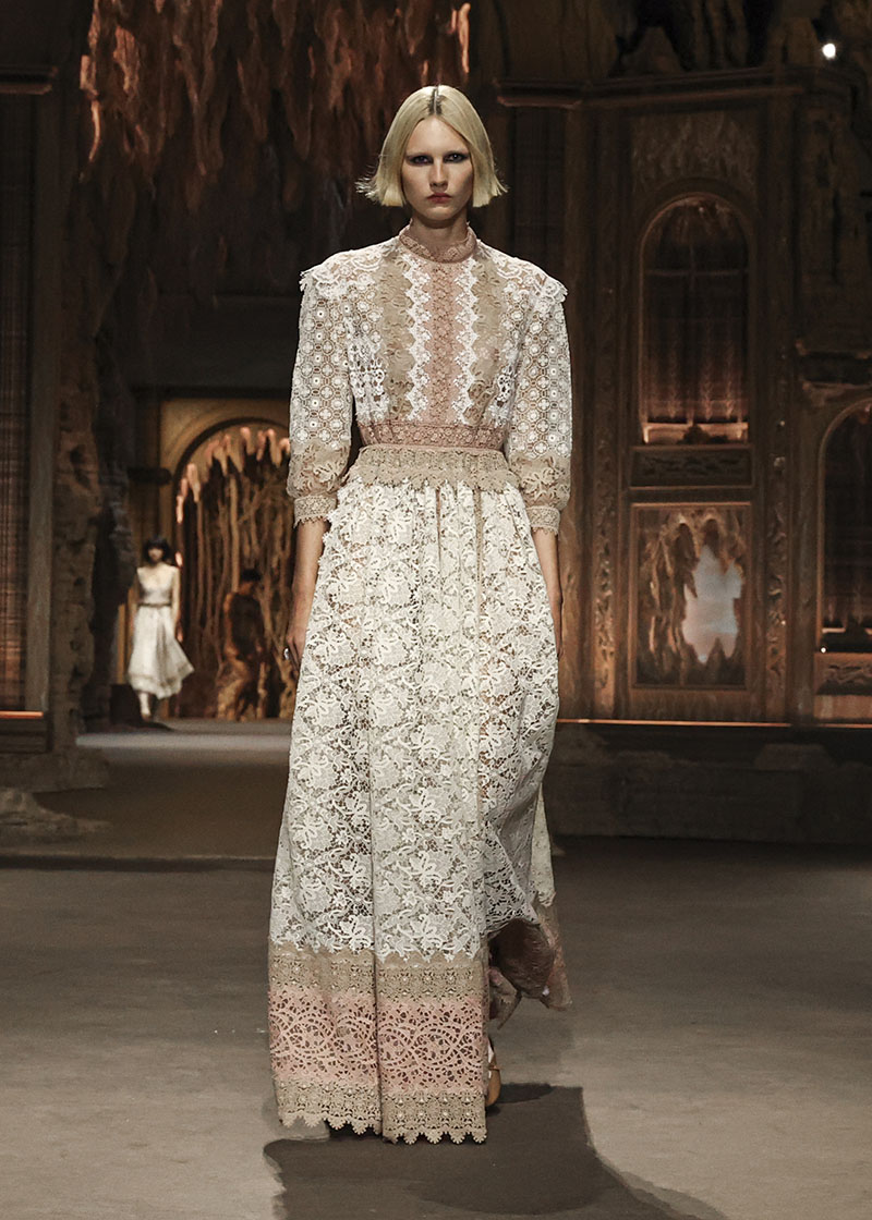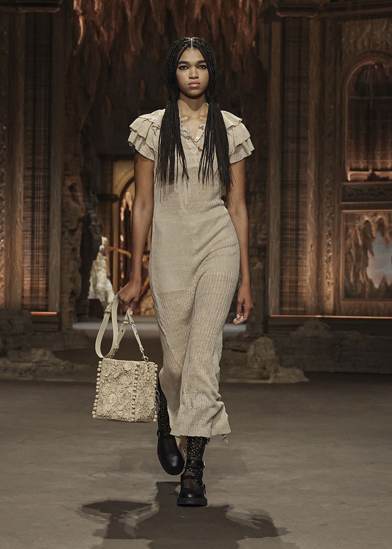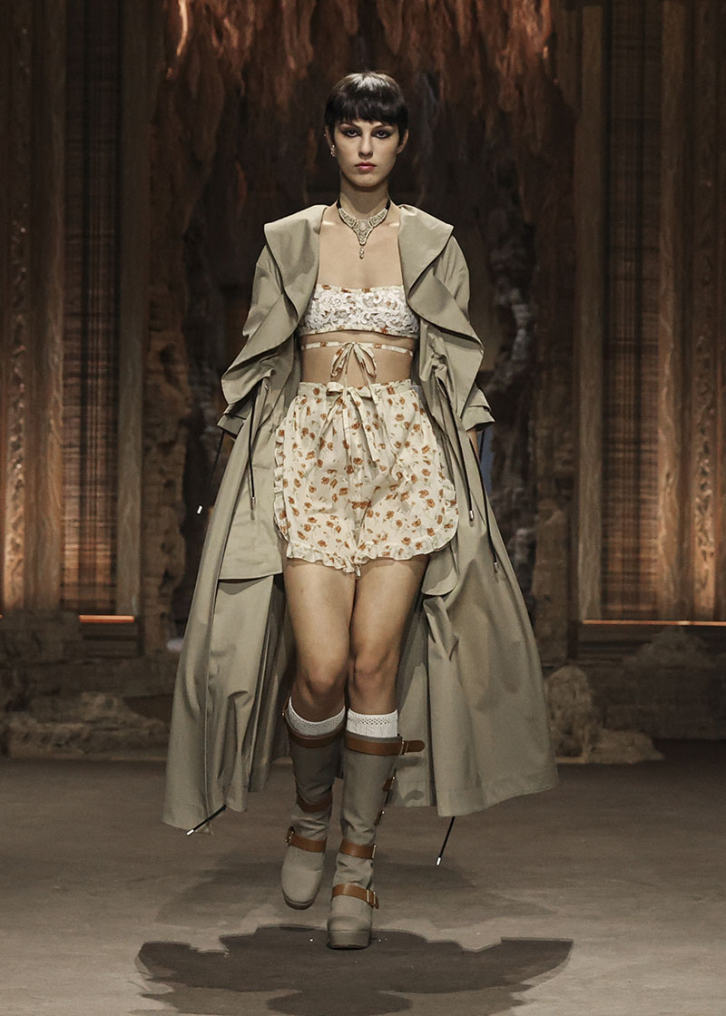 En general la colección recrear un escenario mágico que nos envuelve gracias a una delicada paleta cromática de suaves tonos tierra llenos de bordados que muestran el lado más delicado y exquisito del savoir faire de la actual directora creativa de las colecciones femeninas de la maison.