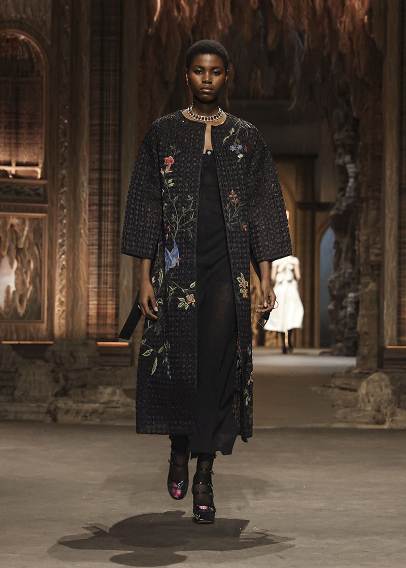 En los dos otros dos “grupos de looks” predominan por un lado el color negro y por otro el color blanco como base, ambos dos con ligeros toques de color a través de estampados que representan las flores de los Jardines de las Tullerías creados por deseo de Catalina de Médicis.