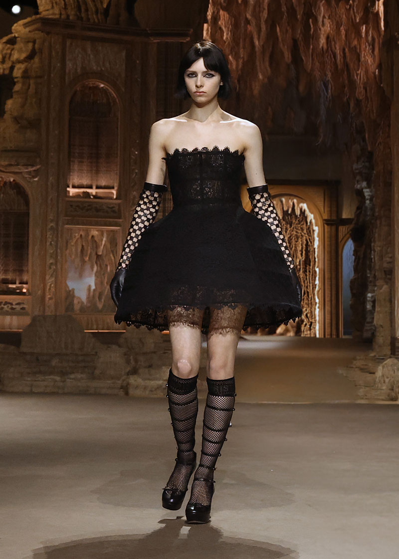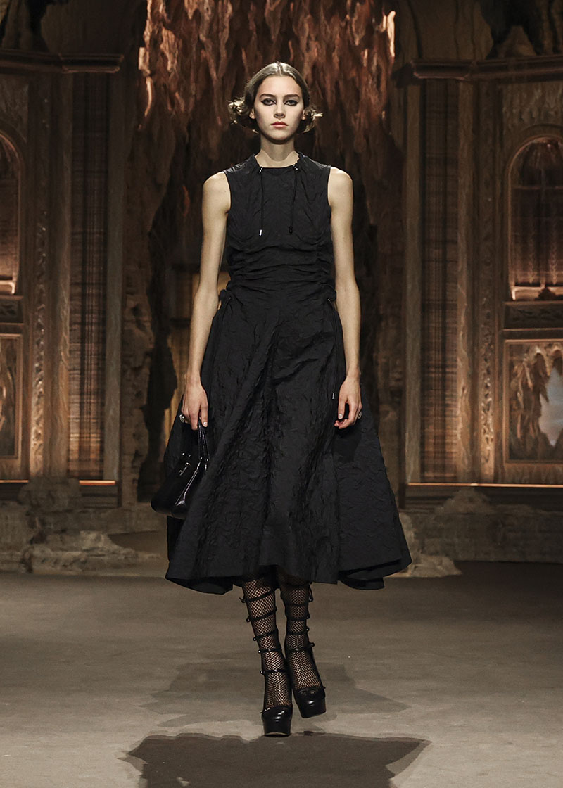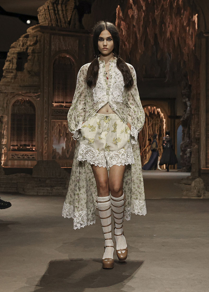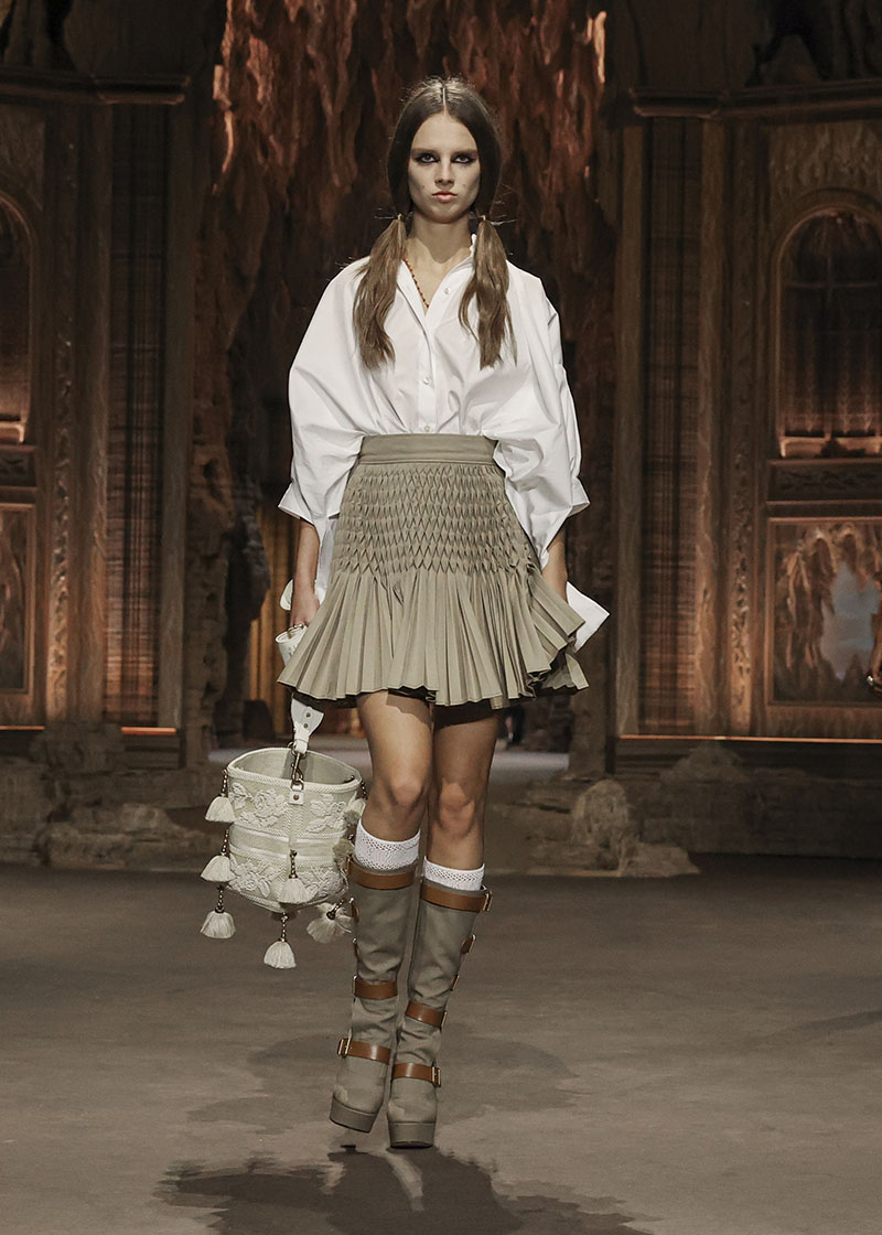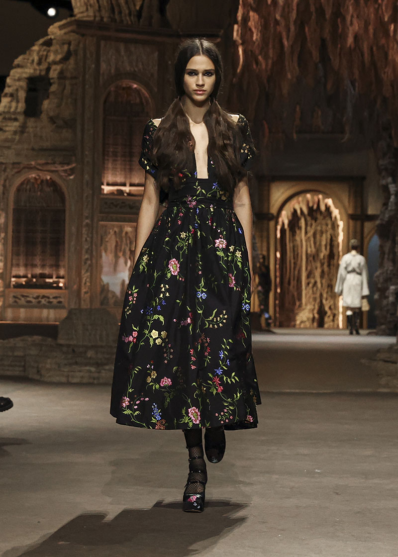 Es por eso que en la nueva colección de Dior SS23 Ready-to-Wear nos encontramos con una gran variedad de looks llenos de tintes que recuerdan a las vestimentas del siglo XVI, como los largos vestidos con verdugados que dan volumen a la parte inferior, los zapatos de tacón, o elaborados bordados en chaquetas de corte recto con grandes mangas abullonadas.