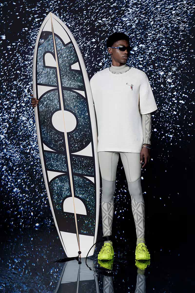 Como elementos especiales de esta nueva colección de ropa de playa, Dior X Parley se ha aliado con Vissla para hacer sus trajes de surfista confeccionados a partir de prendas recicladas. La tabla de surf con el logo gigante de Dior está hecha en colaboración con Notox… no se cuántas personas se la llevarán al agua; pero colgada en una pared se vería espectacular.
