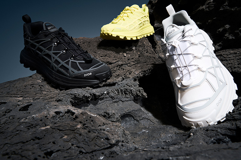 Ligado a la tendencia utilitaria que estamos viendo en las prendas de las últimas colecciones, estamos viendo también un alza en siluetas de sneakers inspiradas en zapatillas de trekking. Dior también nos propone las suyas como tendencias urbanas de verano… y también para la playa. Dior X Parley nos presenta versiones monocromáticas de su runner B31, una silueta utilitaria adornada por un diseño de jaula que recorre todo el upper de la zapatilla y suela estilo track. O, para estar más cómodos en la arena, también tenemos sandalias estilo cannage.