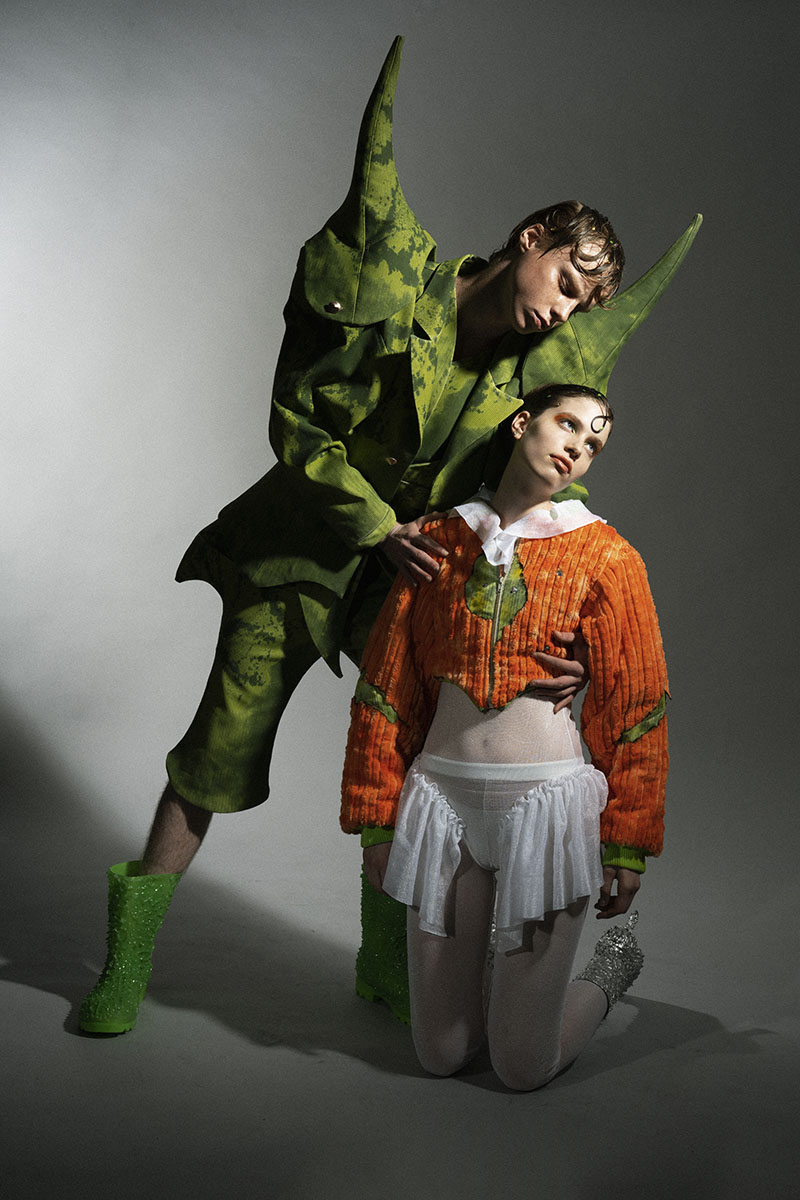 ¿Cuál/es han sido las principales inspiraciones de esta colección? La gran inspiración de esta colección ha sido, como había dicho antes, el relato que yo misma escribí sobre el concepto de la muerte de Dios y sus personajes: El vagabundo loco que anuncia la muerte de Dios, y que a su vez representa la personificación de la muerte, construido a través de las películas Holy Motors y Mr Merde de Leox Carax. Un Dios convertido en fantasma vagando por las iglesias destruidas, vestido con la clásica representación de un fantasma con una sábana blanca. Una niña pequeña en pijama, que es el mismísimo Superhombre de Nietzsche y a su vez me representa a mí misma. Y una virgen caída en desgracia tras la muerte de Dios, obligada a realizar la prostitución para sobrevivir. Puede sonar variopinto todo esto, pero esta locura de historia es lo que inspiró mi colección.
