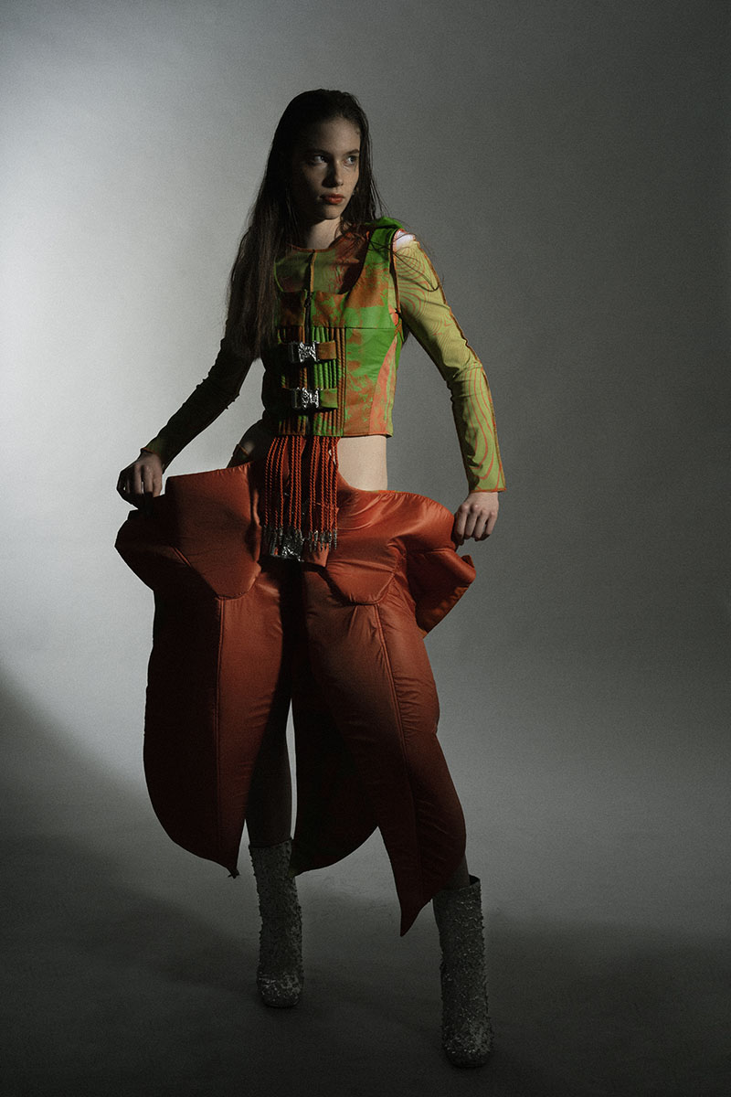 ¿Qué nos puedes contar sobre tu primera colección “Dios ha muerto” ? Bien, creo que de todos los trabajos que he realizado como diseñadora y estudiante es el más visceral y experimental de todos. Quería presentar algo fuera de lo normal, y desafiar lo imposible con estructuras muy grandes y arriesgadas. Desde el primer momento quise que la colección estuviera en esa fina línea entre el arte y la moda. También quise trabajar mucho el color, ya como un reto personal, porque aunque siempre he trabajado mucho con estampados y manipulaciones, nunca había arriesgado mucho con el color, y quería que ‘‘Dios ha muerto’’ cayera en el maximalismo y el dramatismo en todos los sentidos.