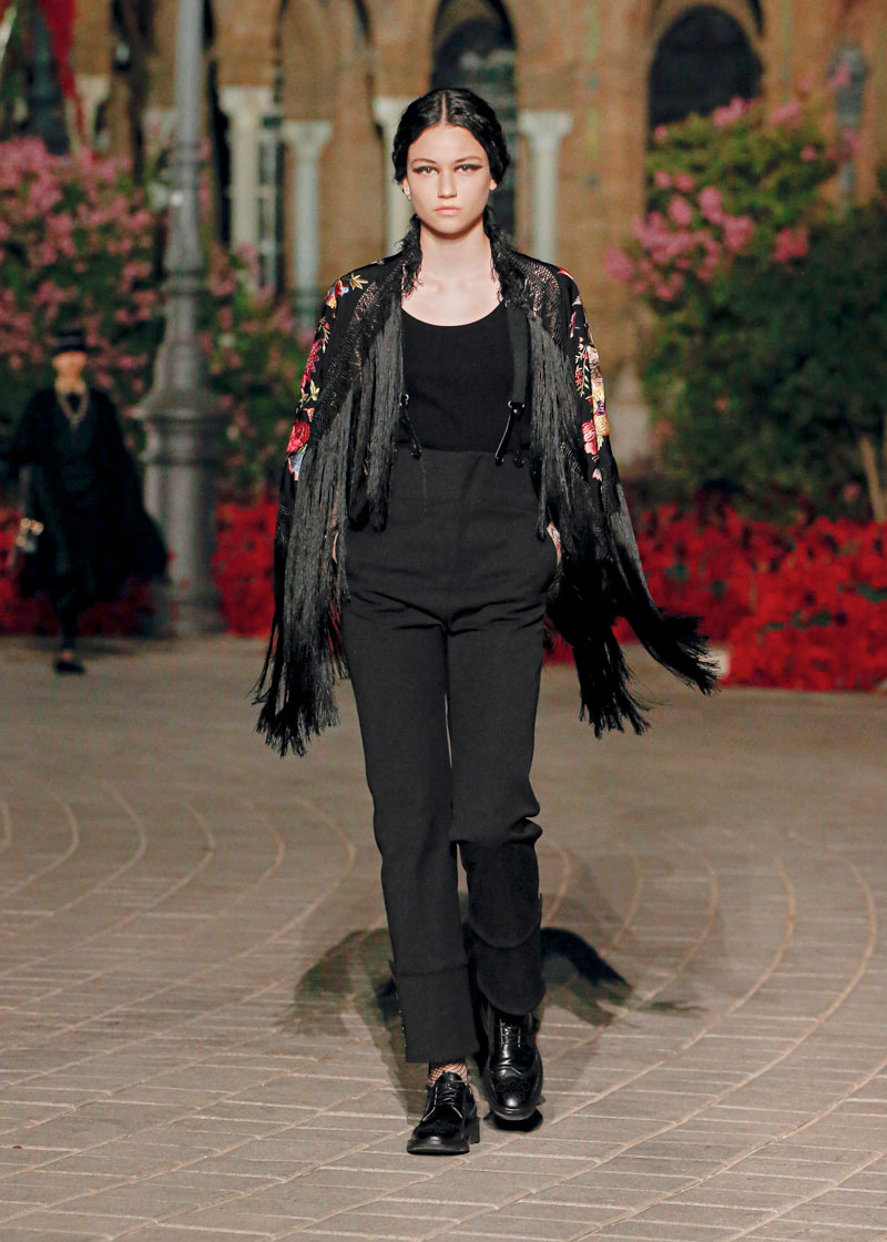 Si no recordáis el desfile ni la colección, os hago memoria: Dior presentó una colección inspirada en la cultura andaluza donde vimos por primera vez mantones de Manila, sombreros cordobeses y hasta abanicos firmados por la Maison. Y claro, ¿dónde más se podía presentar una colección así que no fuese en la Plaza España de Sevilla? Todos los puntos fuertes de esta cultura tuvieron su protagonismo dentro de la colección: las ferias, el flamenco… la tradición ecuestre.