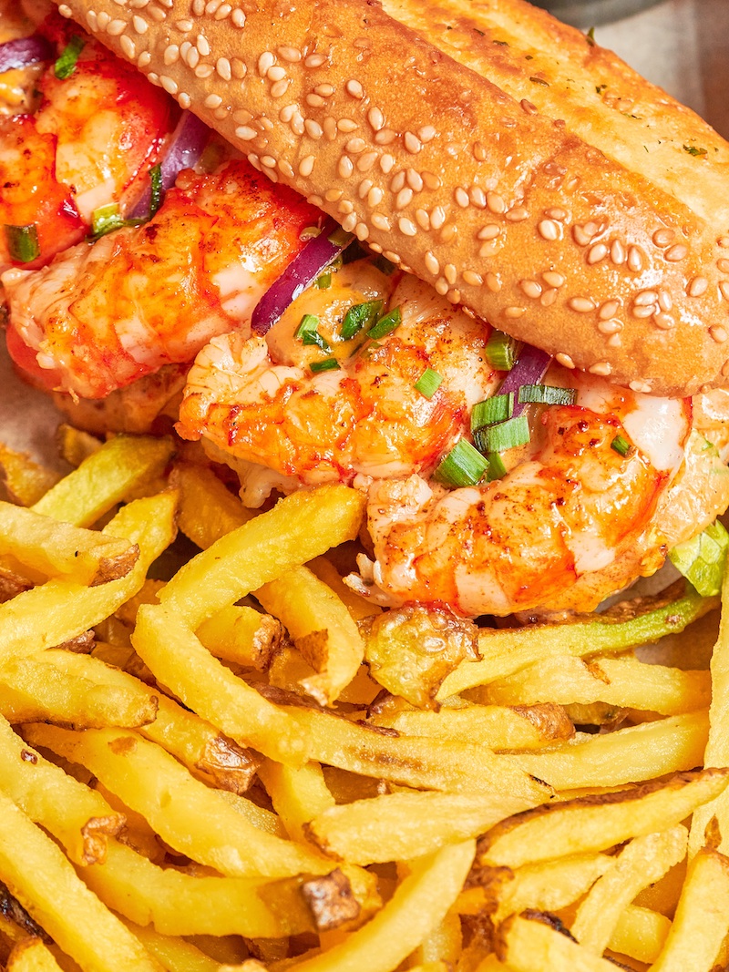 Imagen superior: “Gamba cósmica”: Döggo de gambón a la plancha con cebolla morada, base de lechuga y crema cajún.