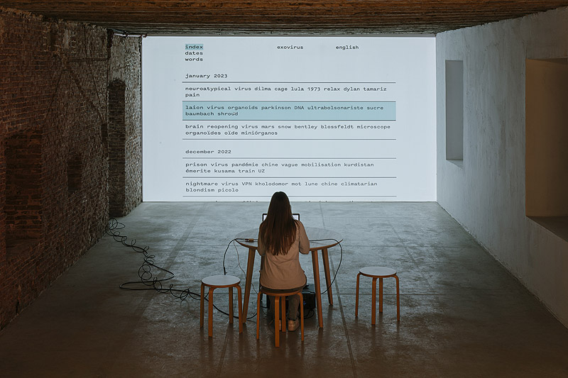 Otra obra que compone la muestra es el diario digital de Dominique Gonzalez-Foerster, “Exovirus”, un laboratorio textual en curso, en el que la artista ha ido añadiendo nuevas palabras y usos desde la aparición del virus y que ha continuado con la crisis de la guerra de Ucrania.