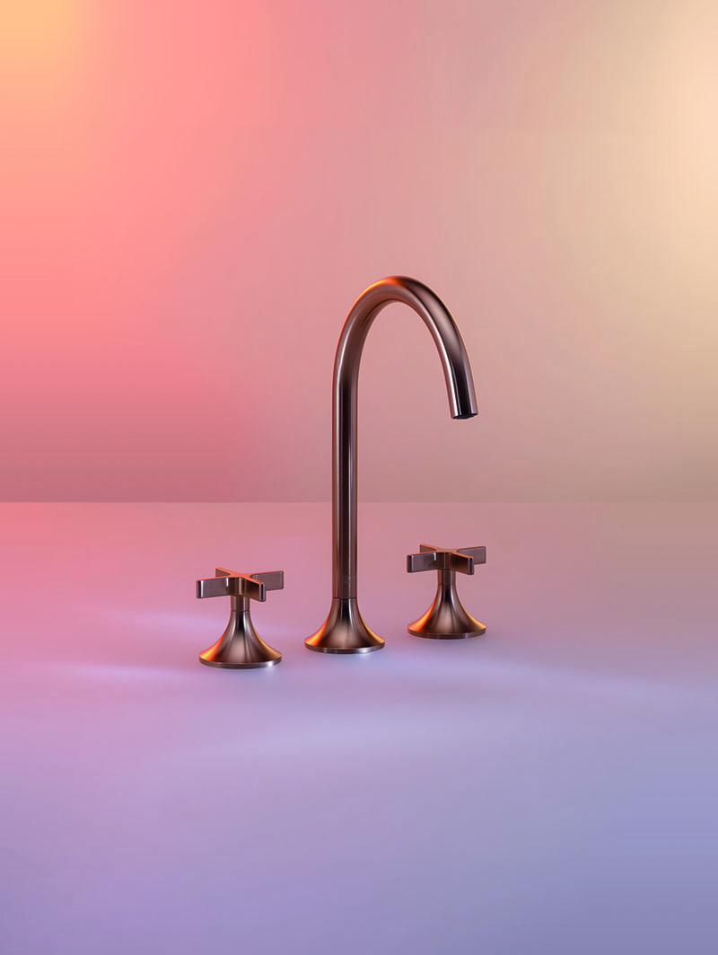 Esta grifería polifacética de Dornbracht, que integra con sutilidad diferentes tonos marrones, está disponible tres diseños. Además, en función tanto del ángulo como de la incidencia de la luz, los acabados se muestran ligeramente distintos ofreciendo así facetas variadas con toques llamativos.