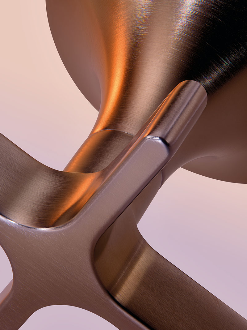 Cada una de las piezas representa la elegancia a través de un juego cromático que armoniza los materiales y las texturas que se han utilizado en la producción. Los tonos metálicos de compleja intensidad se funden creando una estética vanguardista.