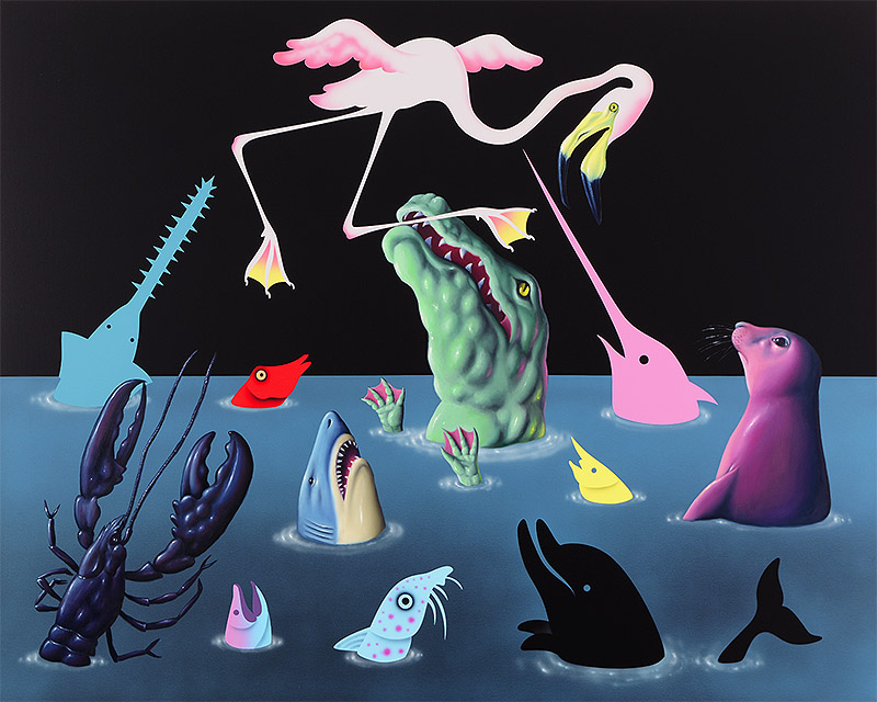 En su obra homónima, un flamenco debería estar alarmado pero no lo está, mientras que criaturas marinas frenéticas dudan en atacar.