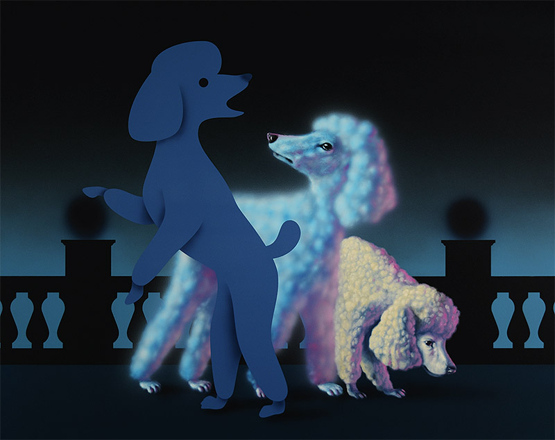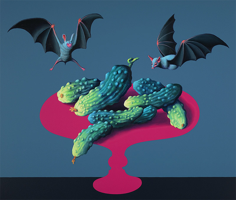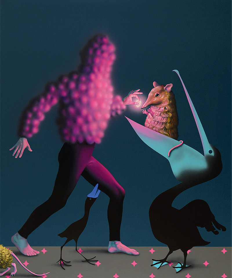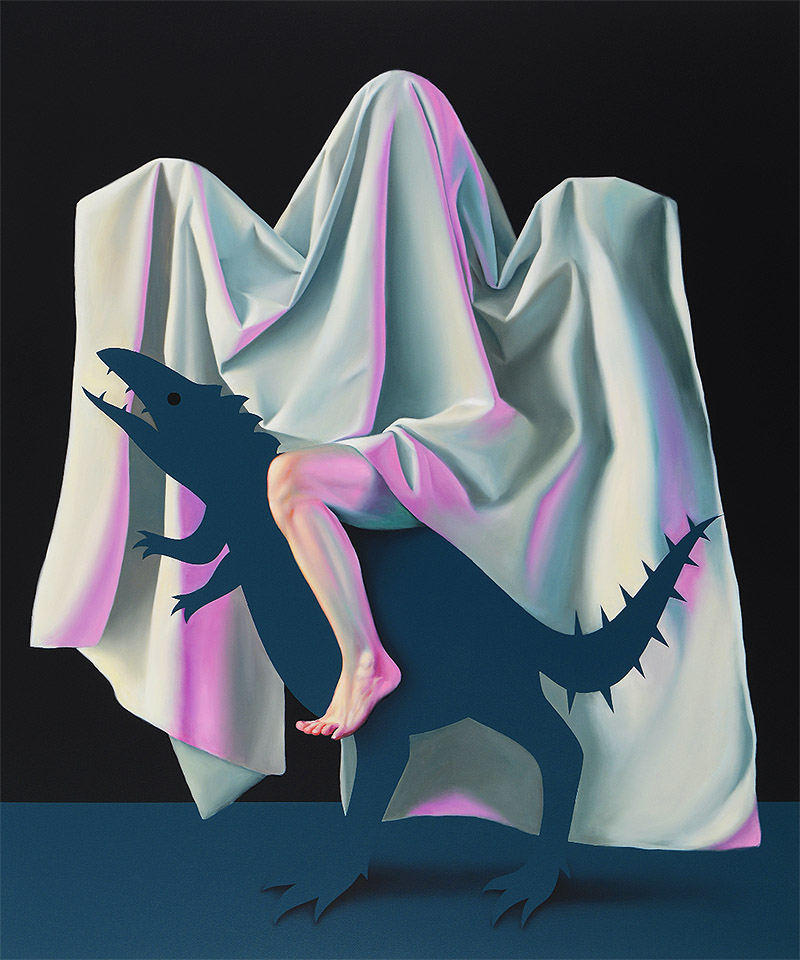 Inspirado por los frescos de Lorenzetti en Siena durante sus estudios de diseño gráfico, Orr descubrió que la mezcla de diferentes estilos podía crear imágenes místicas. Utiliza Adobe Illustrator para crear sus diseños de “notan” en 2D, que luego pinta a mano sobre lienzo, añadiendo detalles realistas de “claroscuro” en 3D. La calidad de enfoque suave de las superficies pintadas con aerógrafo añade una dimensión que resalta el cambio entre lo realista y lo emblemático, como se ve en “Lo real, lo irreal y lo improbable”.