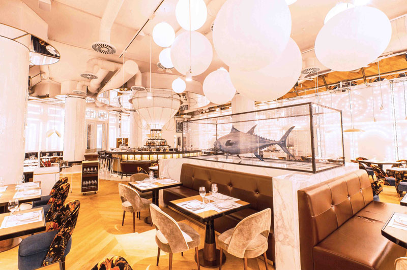 El escenario para disfrutar de este concepto y entrar a competir con la oferta de brunch castizo está presidido por una vitrina que contiene la escultura de un gran atún rojo. Las 7.000 bombillas que recuerdan el alumbrado del ferial de Málaga invitan a que la fiesta no decaiga. El brunch, sin haber arraigado en costumbre, se ha convertido en Madrid en acto hedonista para ver y ser visto. En BIBo esto funciona como en los mejores teatros. Al grano: el desglose de pases se compone, además de por zumo de naranja, té o café, de bollería artesana (cruasán, brioche tostado, napolitana de chocolate) con mermelada y mantequilla, de su reconocido yogur de foie con oporto y parmesano, de fruta osmotizada, de tosta de tomate con albahaca, de Baby hot dog y de algunos platos calientes, a destacar sus clásicos huevos Benedictine o el huevo a la Florentina, el bocata de roast beef o el de bogavante con pan pretzel.