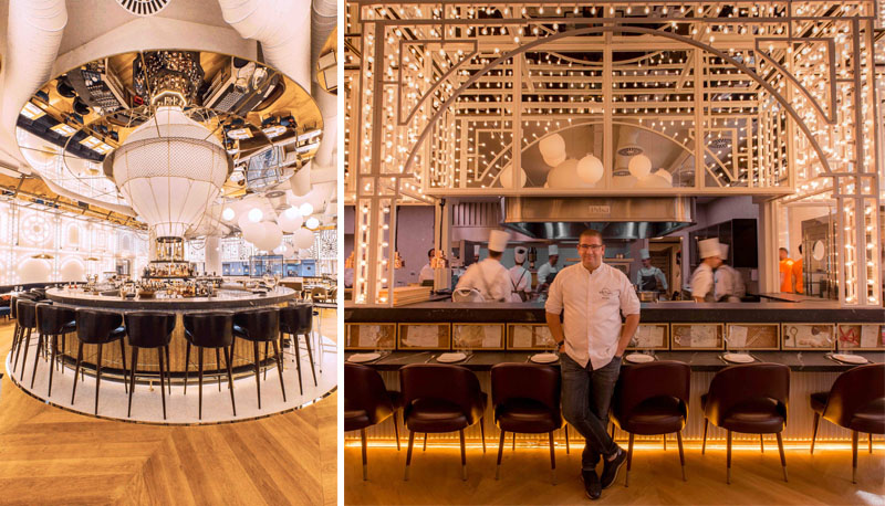 Imagen superior izquierda: barra central del restaurante. Derecha Dani García posa delante de la cocina abierta de BiBo