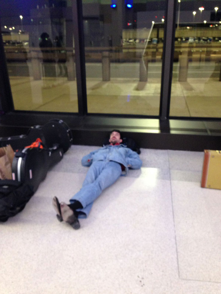 Arriba: Pablo de Bifannah durmiendo en el suelo del aeropuerto de Nueva York de camino a Austin.