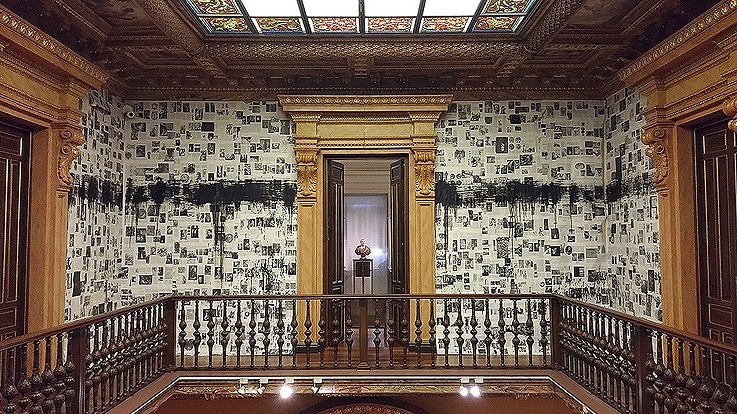 Jorge Galindo recoge el testigo realizando para esta ocasión un gran collage compuesto por miles de páginas de la revista Goya, publicación editada por la Fundación Lázaro Galdiano desde 1954, que invade la totalidad de las paredes del salón de baile y la galería superior del museo.