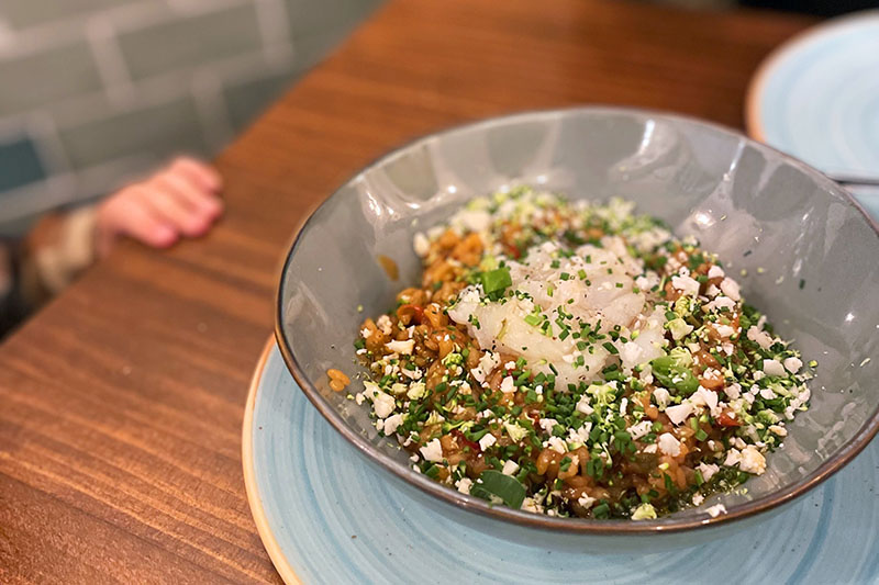 -Arroz meloso de berza y panceta ahumada con carpaccio de bacalao. Original.