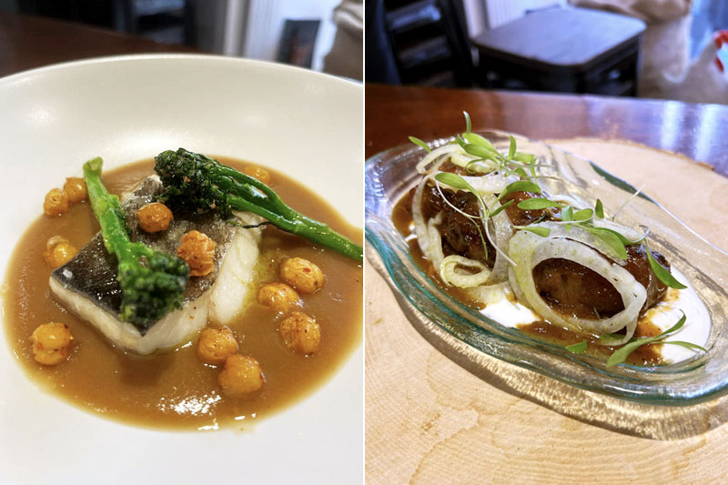 Imágenes superiores: Verdinas estofadas con codorniz asada y Panacota de postre