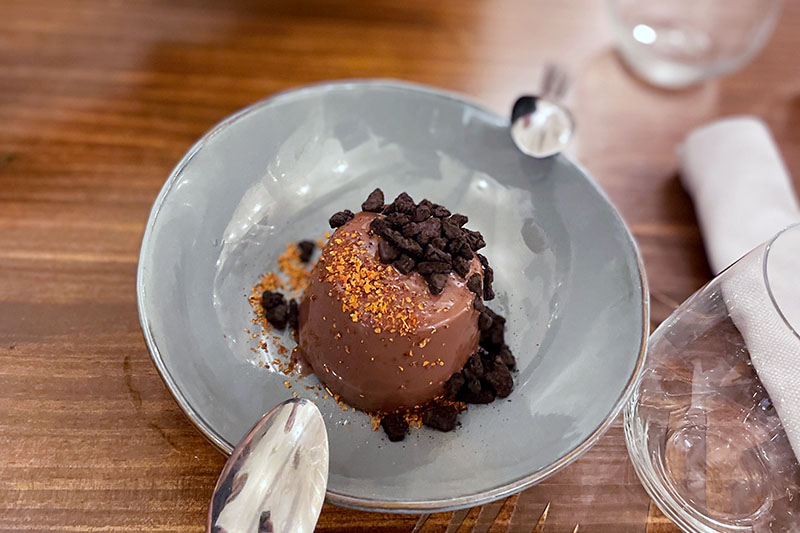 -Mexican panacota de chocolate negro, oreo y chile. Unos de sus postres más representativos.