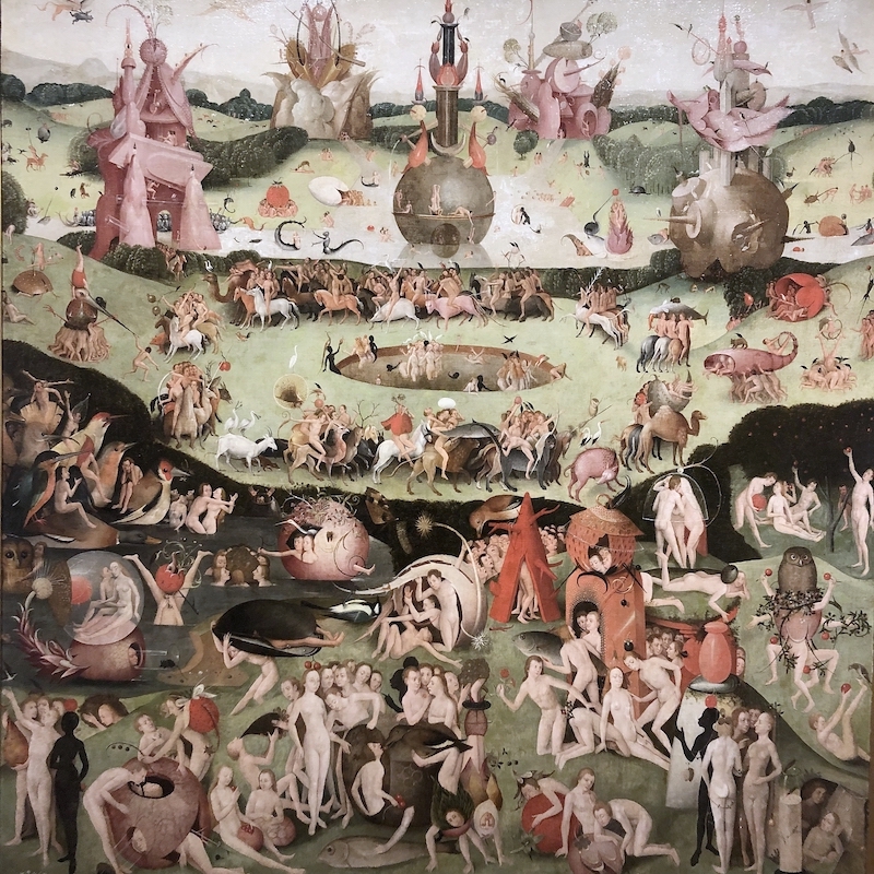 La combinación de lo paradisíaco y lo catastrófico de la exposición se inspira en el tríptico de El Bosco, El Jardín de las Delicias del siglo XV, que también da título a la exposición. Una versión del panel central de la pintura que data de 1535 a 1550, creada por la escuela de Hieronymus Bosch (nombre original de El Bosco), proporciona un punto de partida para la muestra.