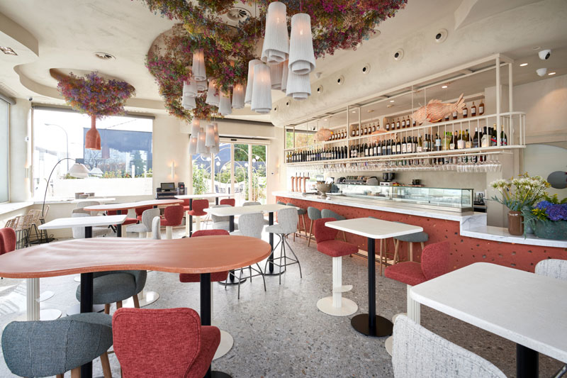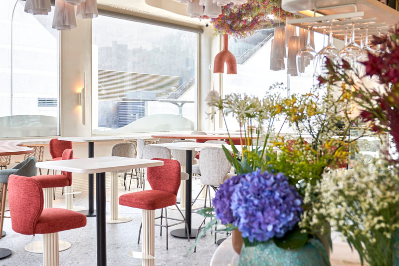 Un local que hace esquina con enormes ventanales y un interiorismo lleno de plantas y color diseñado por Alejandra Pombo que te produce una sensación de alegría y relajación. Cuenta además con un gran jardín que puede disfrutar aquellos días en el que el cuerpo te pide sol y aire libre. Su interior está compuesto de mesas altas con taburetes muy cómodos perfectos para una experiencia más informal, algo parecido a las marisquerías con amplias barras de antaño.