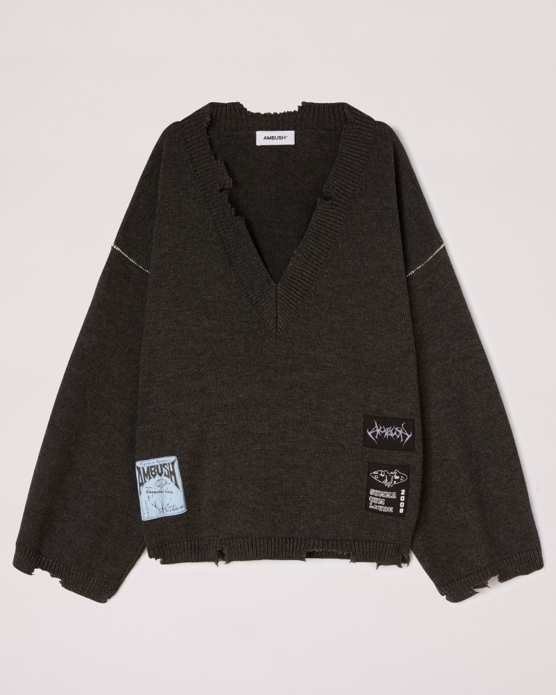 Construyendo sobre la idea del jersey de punto con detalles desgastados, Ambush nos presenta una versión aún extrema. La silueta es muy familiar también… nos recuerda a los jerséis I Love NY de Raf Simmons con su cuerpo boxy y mangas anchas. Sin embargo, este jersey de cuello de pico toma un aire más punki con sus rotos en cuello, puños y cintura… además de estar decorado por parches más radicales. Un jersey como este es la mezcla ideal entre estilo clásico y moda urbana que estamos buscando… y hará de pieza statement sin demasiado esfuerzo.