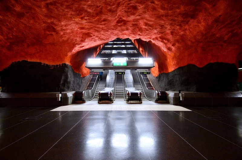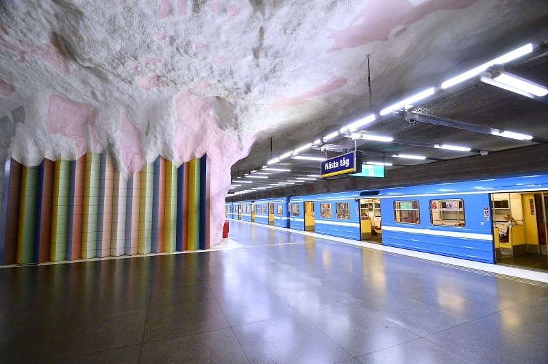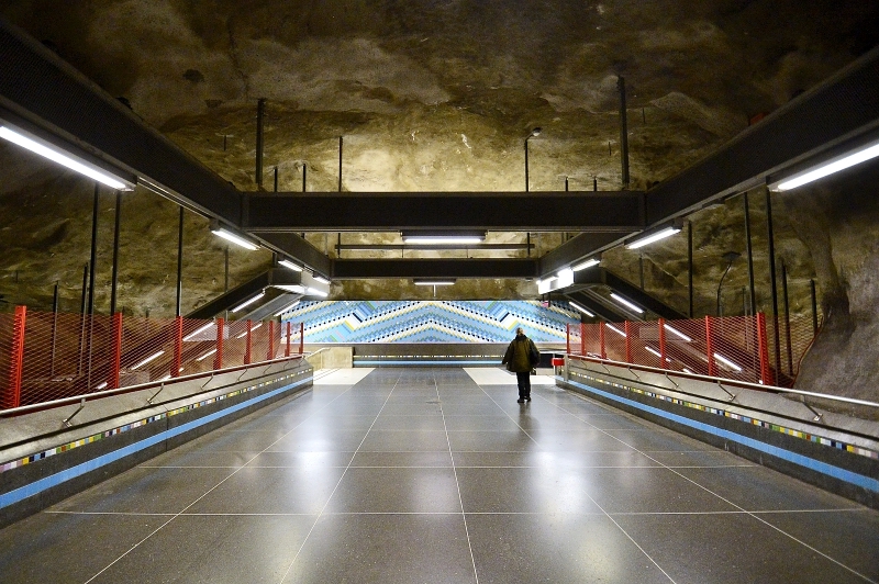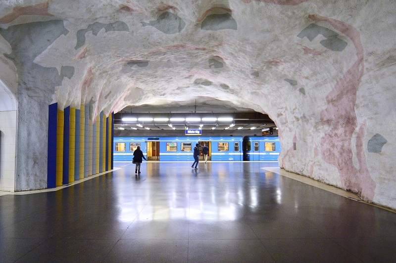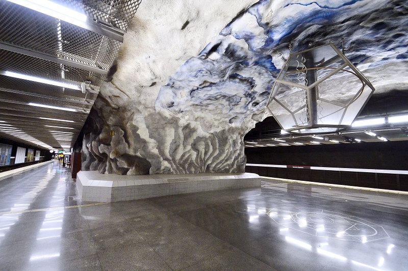 La estación central del metro de Estocolmo fue la primera estación que presentó obras de arte. Cubierta de ramas, flores estilizadas y enredaderas de hojas azules sobre fondo blanco, se la conoce como “el andén azul” y es sin duda uno de los lugares más reconocidos del sistema de transporte público. El artista Per Olof Ultvedt eligió los tonos azules por sus valores estéticos y por su efecto relajante. T-Centralen es un nudo de conexiones donde todo el mundo corre y el artista quiso proporcionar con su obra una modo de relajarse al observala.