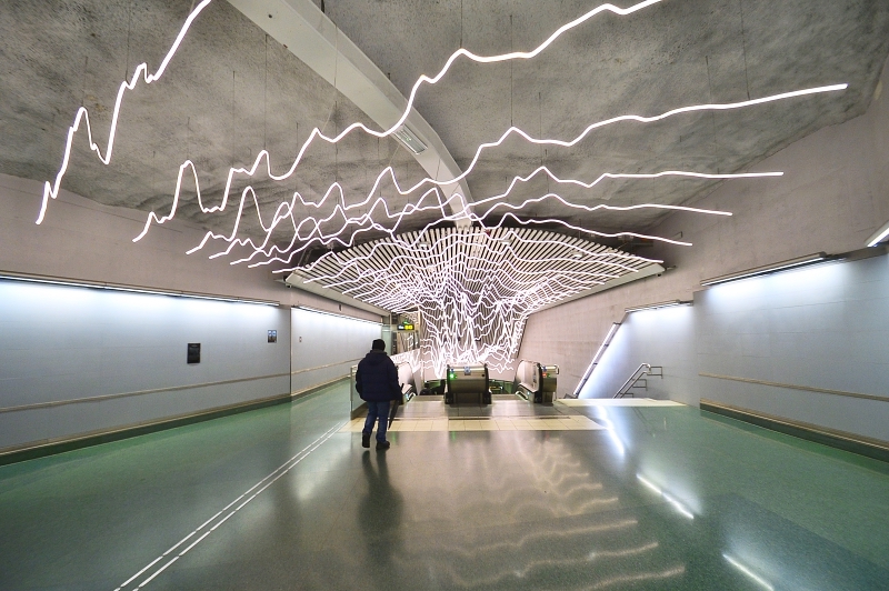 Colgada del techo del pasillo de la entrada oeste de la estación Odenplan, la instalación titulada Life Line de David Svensson consiste en líneas blancas dentadas de luz fluorescente que brillan intensamente. Cuatrocientos metros de iluminación LED que aparte de alumbrar representan los bioritmos del corazón del hijo del artista, como se mostraban en el monitor CTG durante el parto.