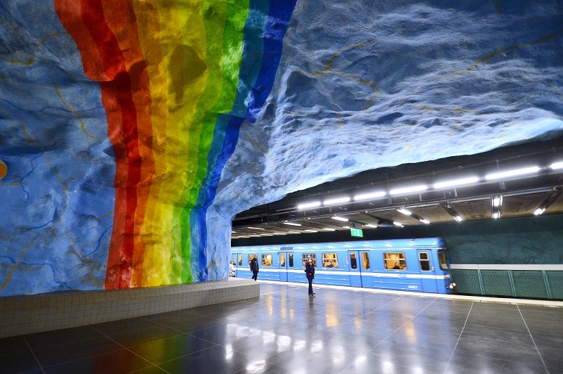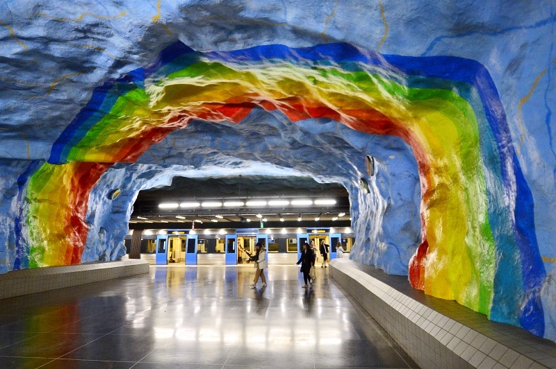 Cada año el distrito de Östermalms acoje el festival del Orgullo Gay de Estocolmo. Por eso la cercana estación de metro, Stadion, esta decorada con hermoso arco iris de vivos colores que contrasta con el azul brillante de las paredes de los túneles de la estación que da la bienvenida a los asistentes al festival y a los que no. Una de las primeras estaciones subterráneanas del metro de Estocolmo, se construyó en 1973. Aparentemente los suecos son depresivos por naturaleza, y las autoridades temian que el acceso al subsuelo supusiese asociaciones con el inframundo y otros lugares infernales. Por eso, el azul brillante y el arco iris sirven como un recordatorio de que hay cielo y colores arriba.
