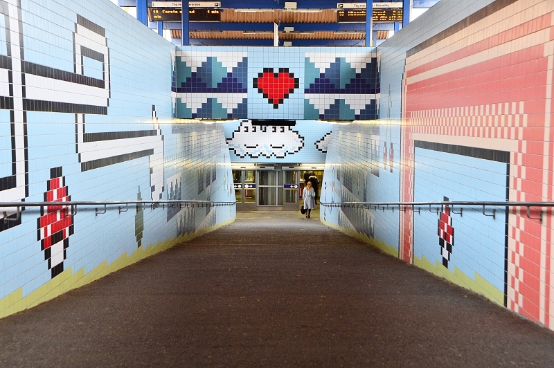 Esta estación es una de las tres a nivel de calle en el centro de Estocolmo. La estación fue construida en 1952, pero la obra pixelada de Lars Arrhenius es una adición de 2008. La pieza fue comisionada con la condición de que tenía que usar azulejos.