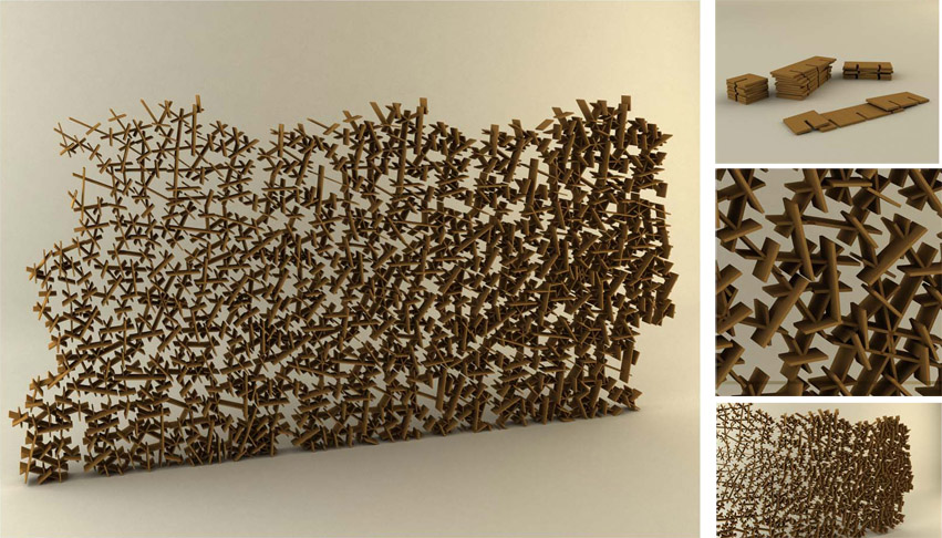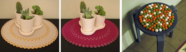 Kiitos presentó un biombo hecho de trocitos de cartón reciclado, la alfombra Roof realizada con tejas de fieltro, unos taburetes inspirados en los asientos de algunos taxis y unos tapetes muy nórdicos.