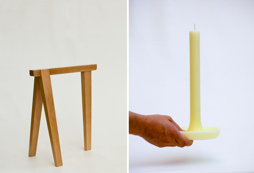Caballete 001 para mesa. Con una sola pata por el lado donde uno se sienta. Der: Candela, candelabro y vela