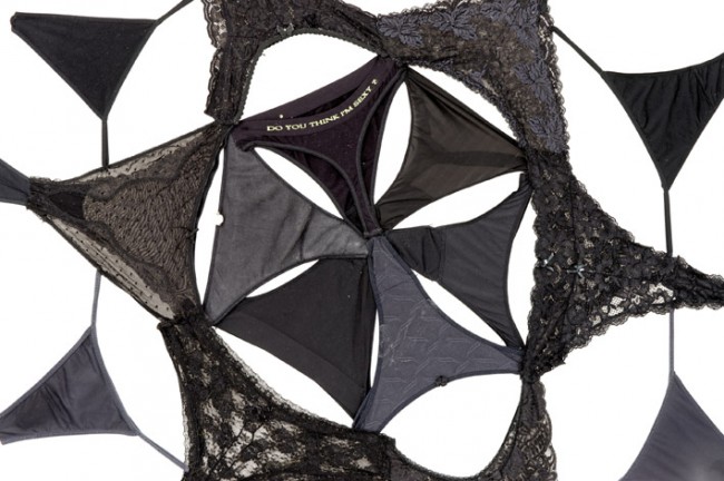 En 2012, con el título de ‘El origen del nuevo mundo’ Pilar Albarracín comenzó un conjunto de creaciones plásticas a partir de ropa interior femenina donada por su circulo más allegado. Desde el inicio, el proceso de elaboración de estas obras ya planteaba cuestiones sobre el propio cuerpo. Cuando la artista pidió a diversas mujeres que le dieran sus prendas más íntimas ya usadas, esta solicitud les divirtió, sorprendió e incluso molestó, pero en ningún caso las dejó indiferentes. En ese momento se abrió una discusión sobre sus bragas, rompiendo así una imposición general sobre el tema, siempre marcado por el silencio y la intimidad. La voz de estas mujeres mostró que cada prenda interior tiene una historia y que cada persona tiene una forma particular de comportarse al hablar de ello: vergüenza, relajación, emoción, pudor… Al exponer estas piezas realizadas con prendas “donadas”, la artista muestra a las mujeres no como un objeto sino como un sujeto liberado.
