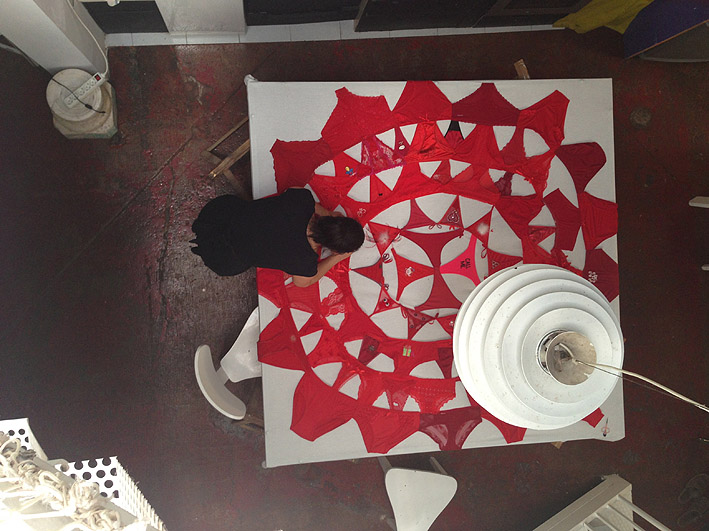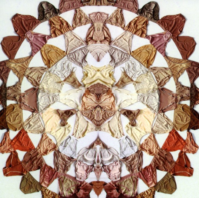 Tras clasificarlas, seleccionarlas y combinarlas siguiendo patrones geométricos basados en los círculos cósmicos, las cosió entre sí para realizar una serie de mándalas. Al recurrir a la costura reafirma el papel que ésta ha desempeñado en la socialización de las mujeres. Por otra parte, el objeto seleccionado – de uso cotidiano – y cómo conseguir cientos de ellos ayuda a multiplicar la intensidad de preguntas mientras se produce un cambio en su naturaleza: el distanciamiento estético los transforma reciclándolos en obras de arte. En palabras de Assumpta Sabuco: “Pilar Albarracín reivindica una experiencia artística más amplia. Son muchas las mujeres que han dejado sus bragas a la artista y ella recoge de la donación el principio que Marcel Mauss ya apuntó: el gift, el regalo otorga a los objetos un valor esencial del que carecen en la vida cotidiana”. Texto extraido de la nota de prensa.