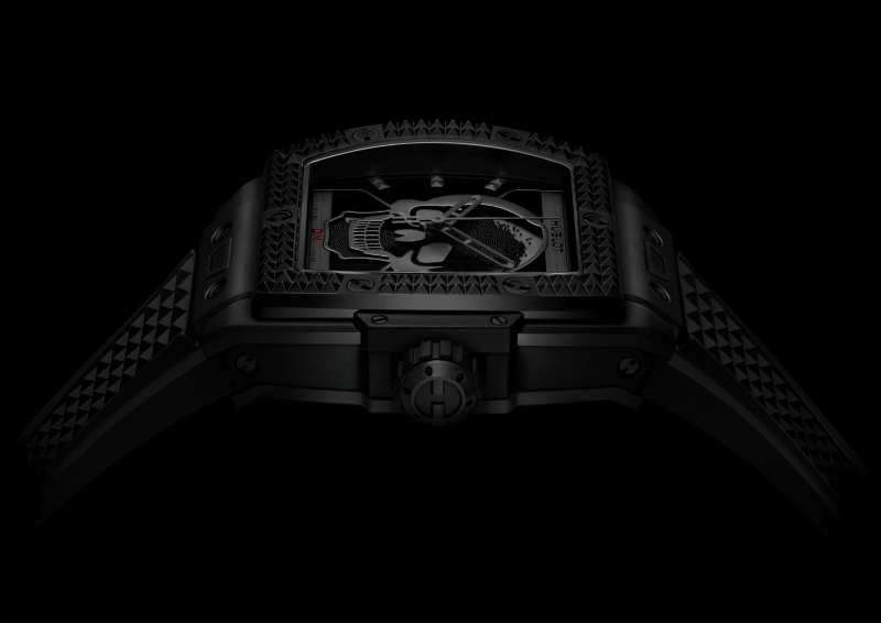 En la esfera, nos encontramos un fondo negro que deja ver una calavera y un reloj de arena, referenciales a la idea central del álbum. El reloj de arena se llena con esferas de cerámica negra que convierten este motif en un elemento funcional. Siguiendo el tema de las tachuelas, los indicadores clásicos se han reemplazado por ellas y las agujas se han acabado en matte. Esta pieza de Hublot X Depeche Mode viene con una correa de goma texturizada con el mismo motivo. Y también con una correa de nylon para un look más comedido. Lo único de color que vemos en todo el frontal es el logo DM en rojo, puesto en la sexta posición.