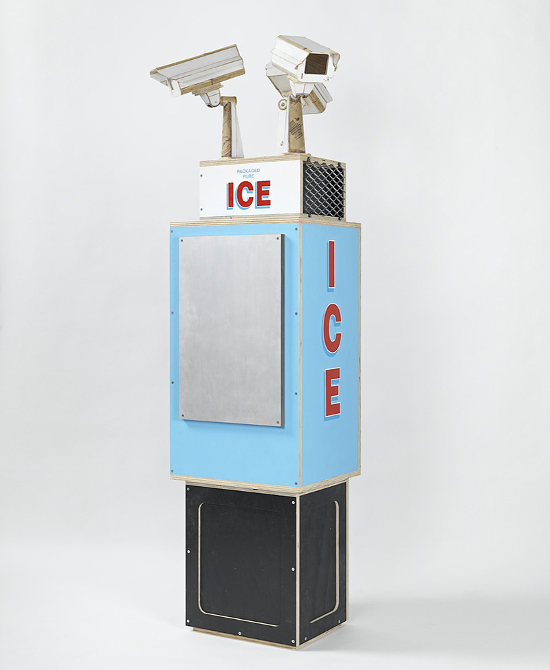 La caja de hielo es un objeto cotidiano que se encuentra a menudo fuera de estas bodegas. Tom Sachs ha creado el tótem ICE (2020) con tres cámaras de video vigilancia realizadas en madera contrachapada montadas sobre un pedestal hecho a partir de tres modelos de cajas de hielo. De esta forma, la escultura se convierte en un panóptico e introduce el tema de la vigilancia en los espacios urbanos. Una oda contemporánea al texto Vigilar y Castigar del filósofo francés Michel Foucault. Texto también queda perfectamente ilustrado si se da un simple paseo por cualquier barrio de Nueva York.