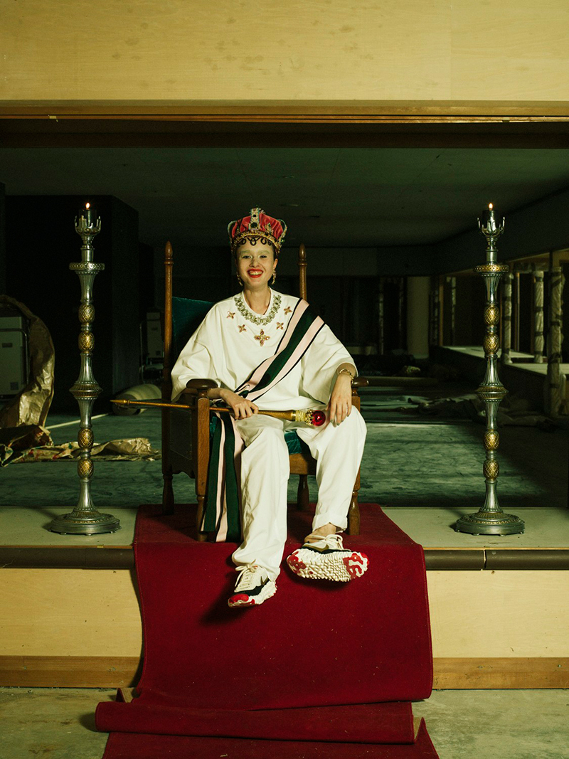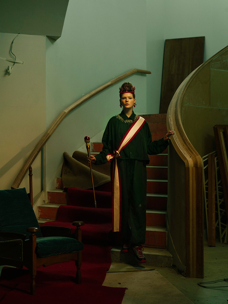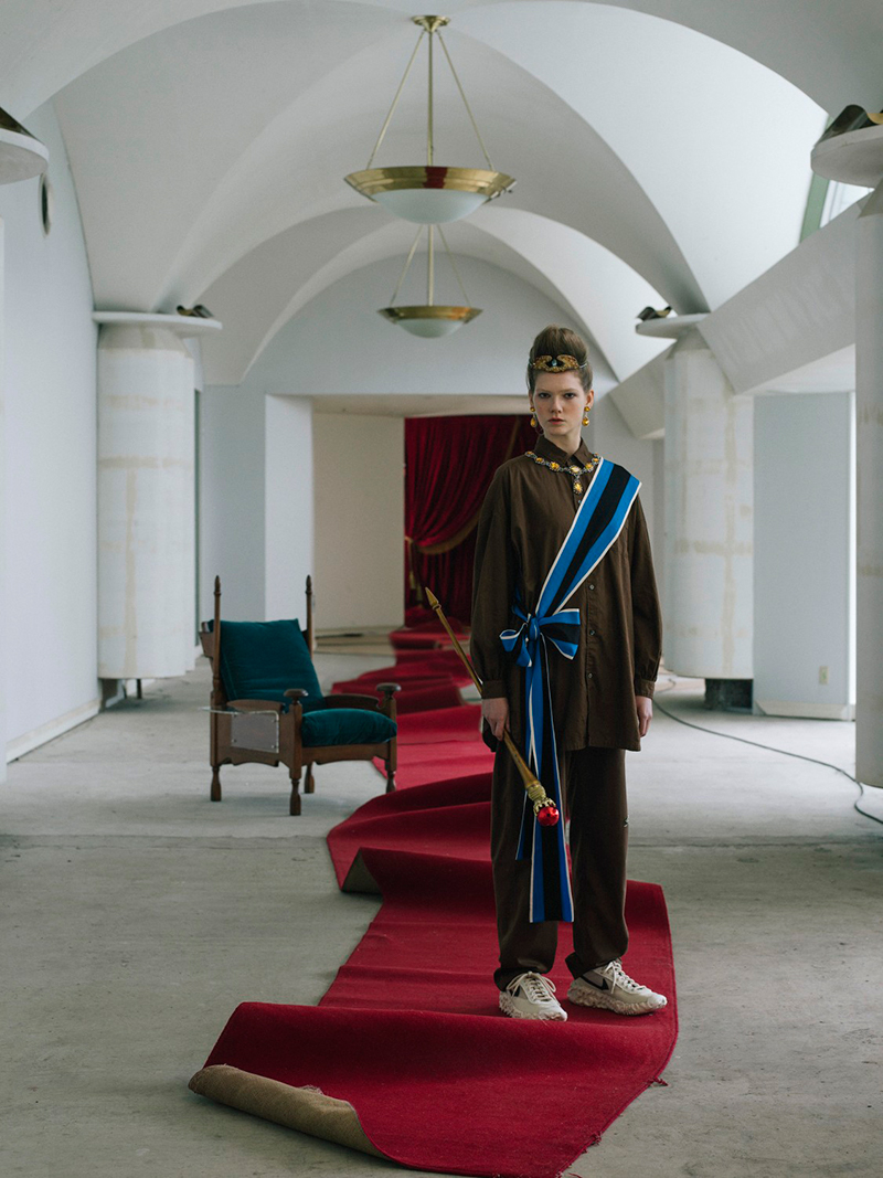Para cerrar la colección de Undercover SS21, nos presentan “The Royal Family of the Basement”, una propuesta más cercana al streetwear que muestra conjuntos de dos piezas de chándal combinados accesorios ostentosos como tiaras y coronas o joyas lujosas y atrevidas.