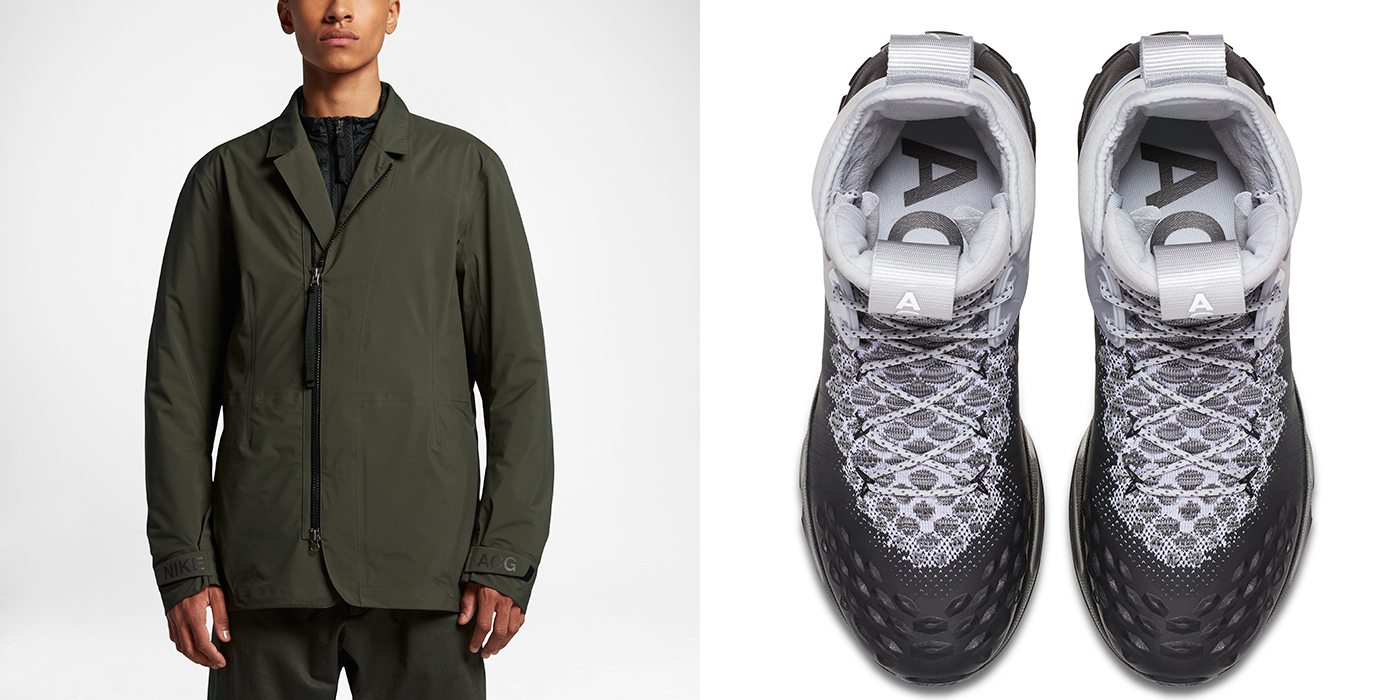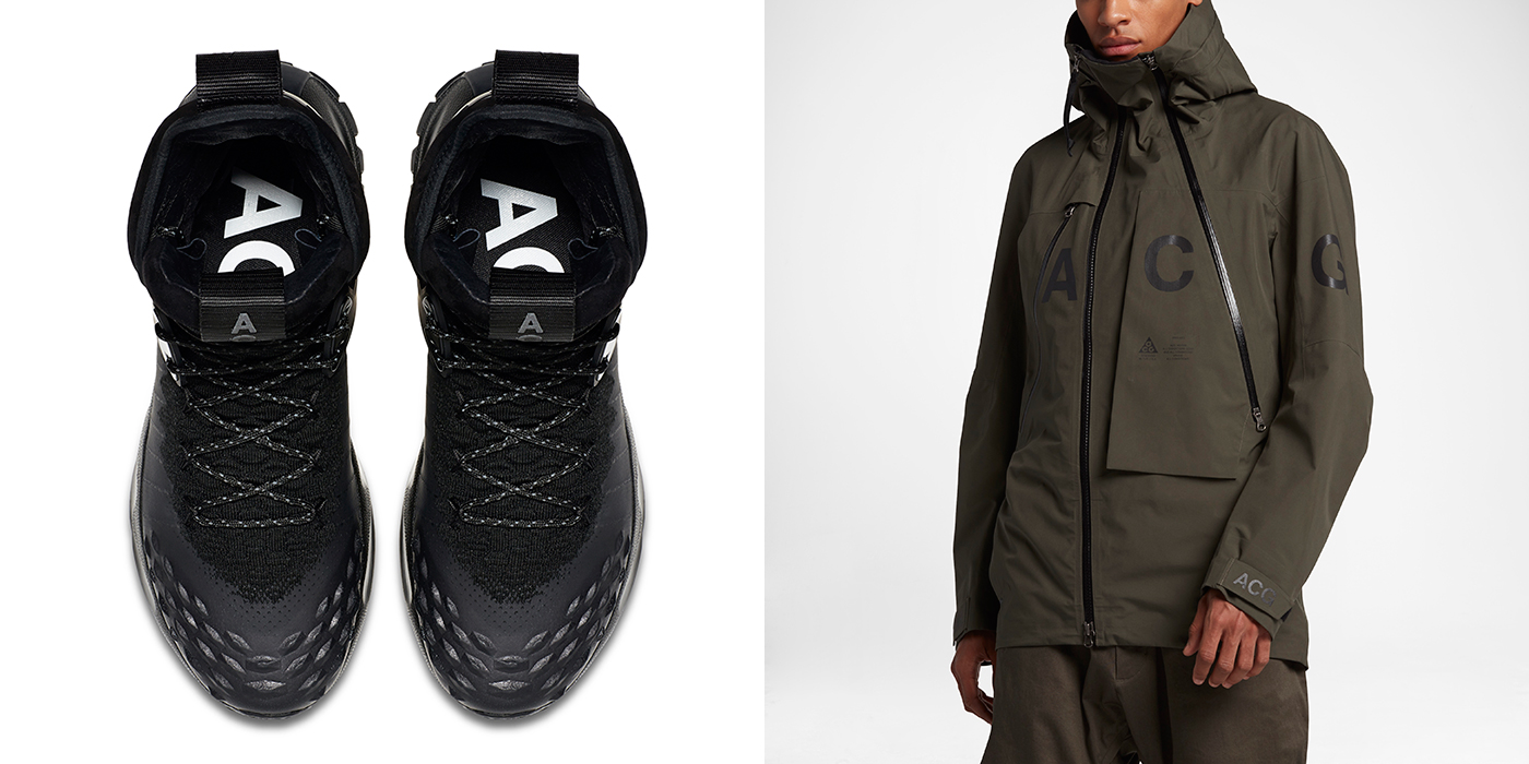 La mayoría de las prendas exteriores para esta temporada incluyen un sistema interior de correas, presentado el año pasado, que permite a los usuarios llevar la chaqueta como si fuera una mochila al entrar en algún edificio. Una nueva prenda, la NikeLab ACG Scaiter, presenta un innovador sistema de cierre “wrap and tuck” que permite adaptarse a distintas temperaturas. La NikeLab ACG Metamorphis Jacket incorpora una tecnología de cremallera especial que permite combinarla con otras varias prendas ACG.