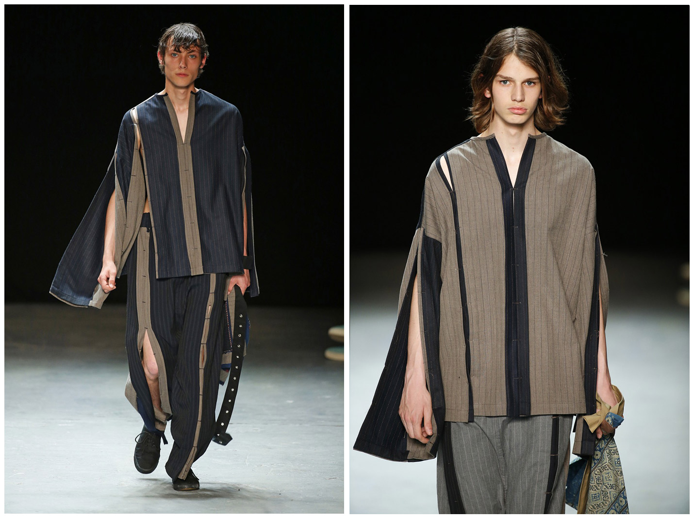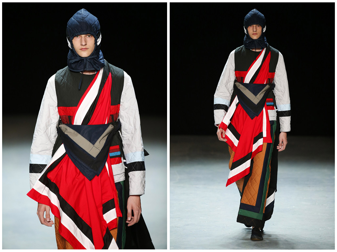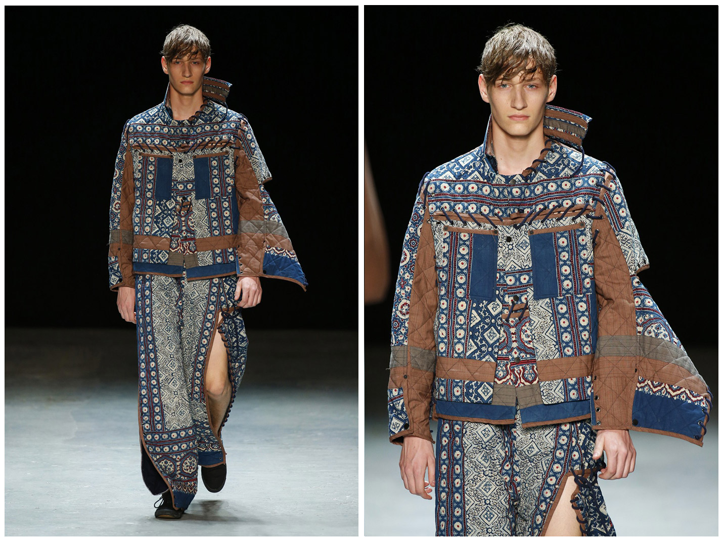 1- Graig Green: El joven diseñador británico apuesta por una visión folcórica, mística y a la vez futurista y nómada, con algunas referencias a cómics de ciencia ficción como puedan ser Arzach de Moebius. Hombres vestidos con aires folclóricos que recuerdan a los de alguna festividad celta, piezas que se abren para volver a ser recompuestas mediante suturas y túnicas que cada vez son más contemporáneas, solo tienes que ir a algún de, por lo menos de la Comunidad de Madrid, y ver como los hombres musulmanes visten, tan frescos.