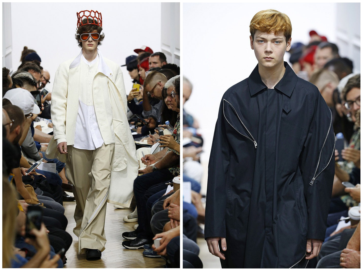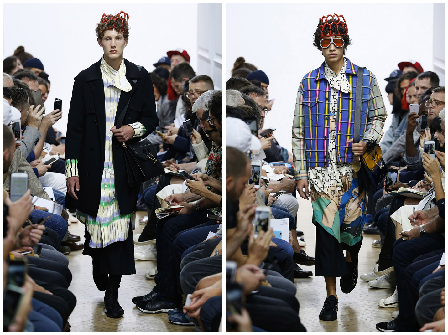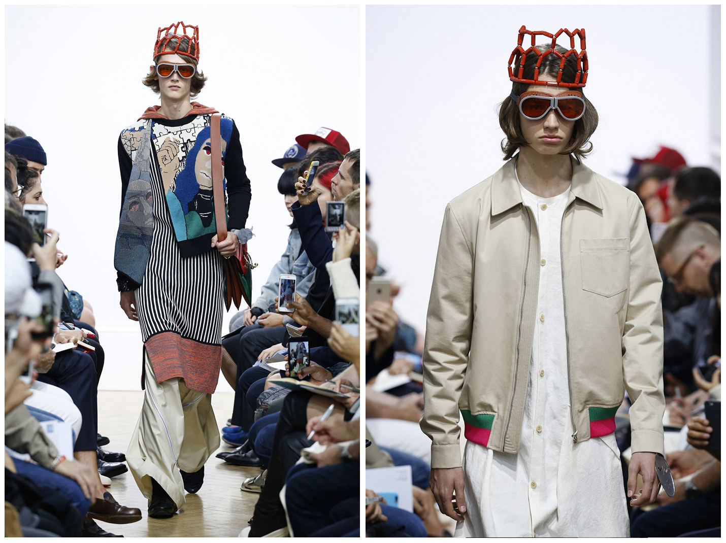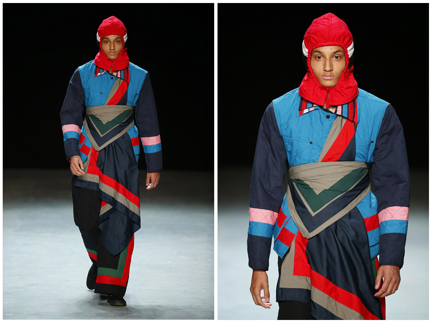 1- Graig Green: El joven diseñador británico apuesta por una visión folcórica, mística y a la vez futurista y nómada, con algunas referencias a cómics de ciencia ficción como puedan ser Arzach de Moebius. Hombres vestidos con aires folclóricos que recuerdan a los de alguna festividad celta, piezas que se abren para volver a ser recompuestas mediante suturas y túnicas que cada vez son más contemporáneas, solo tienes que ir a algún de, por lo menos de la Comunidad de Madrid, y ver como los hombres musulmanes visten, tan frescos.