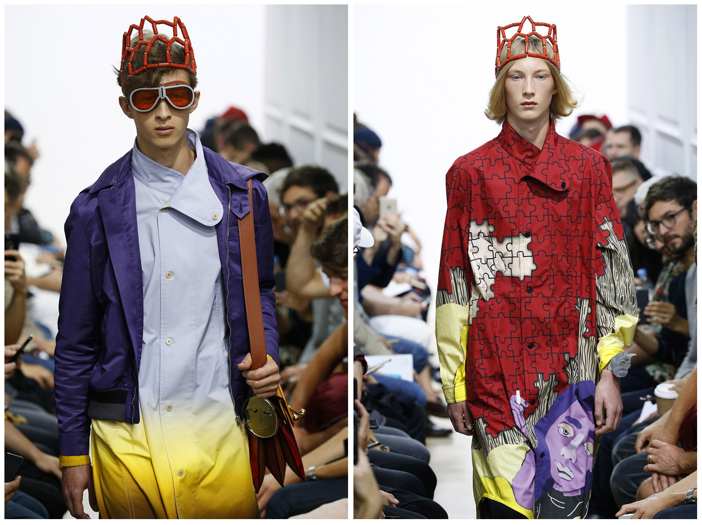 2- Jonathan Anderson: El que también es diseñador creativo de Loewe, presentó una colección de aires infanitl, con prendas extra largas, camisones, bloques de color y coronitas. Un punto naif de la moda masculina inspirado en esta ocasión en el cuento de Antoine de Saint-Exupéry, El Principito.