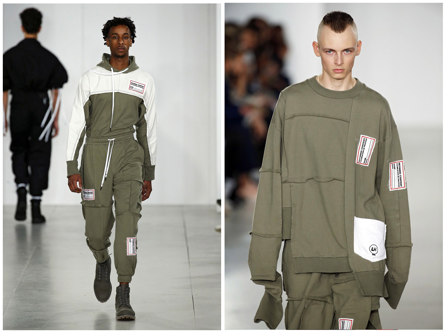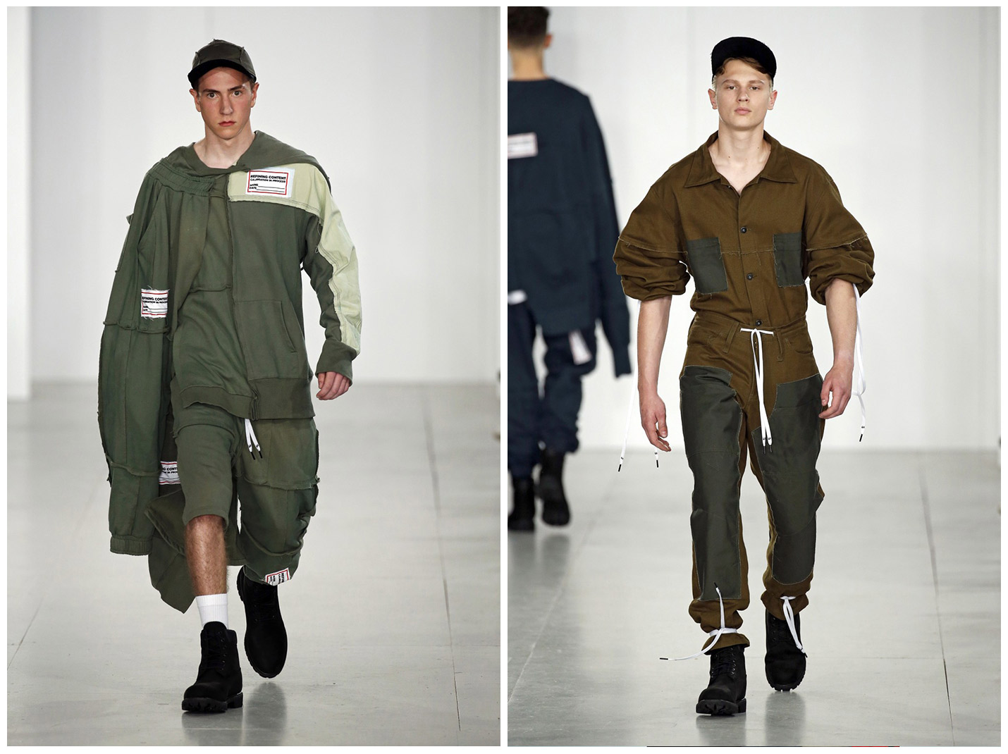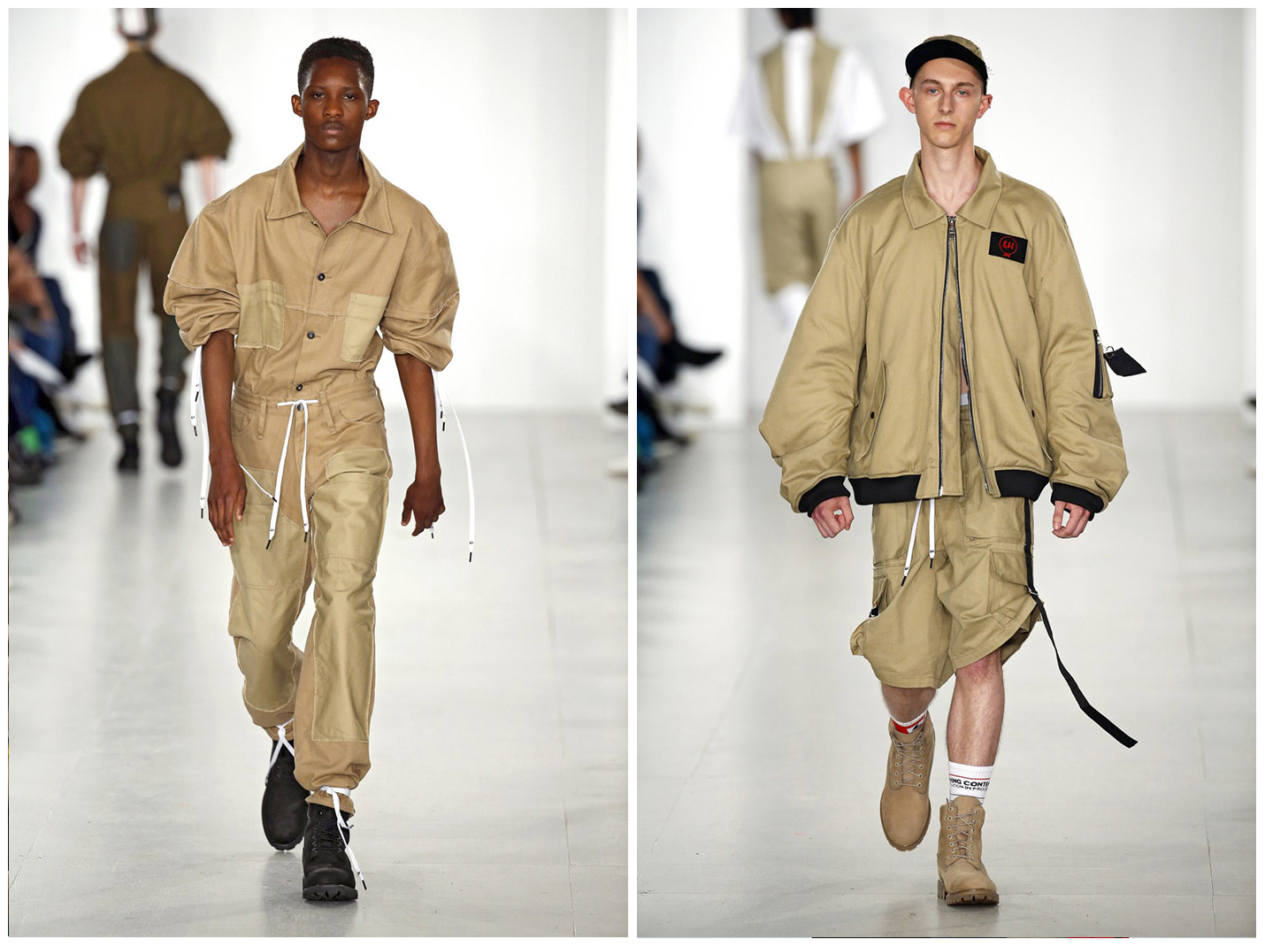 4- Liam Hodges: El diseñador británico sigue fiel a la luchadora clase trabajadora como fuente inspiradora. Para primavera verano 2017 ha centrado su visión en la estética de la aviación de alguna de las guerras mundiales. Vemos bombers oversized, mangas abullonadas, verde y caqui militar, prendas deconstruidas, costuras vistas, asimetrias… una reinterpretación moderna del uniforme militar. No sé porqué, pero algo en esta colección me recuerda al capítulo de la vida de Joseph Beyus en el que se estrella con su avión y unos tártaros le rescatan de morir congelado.