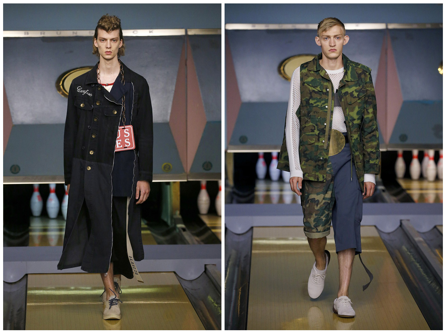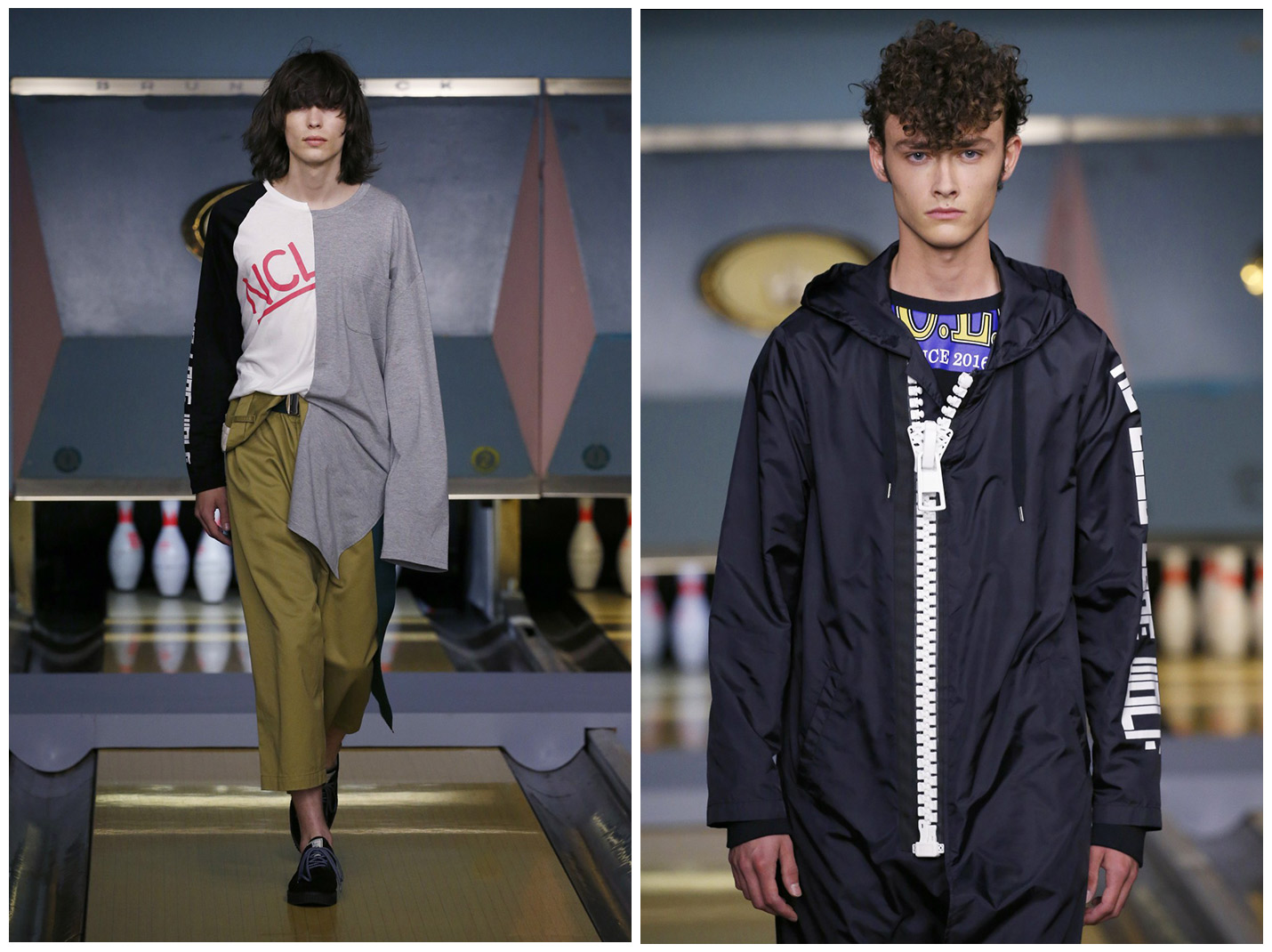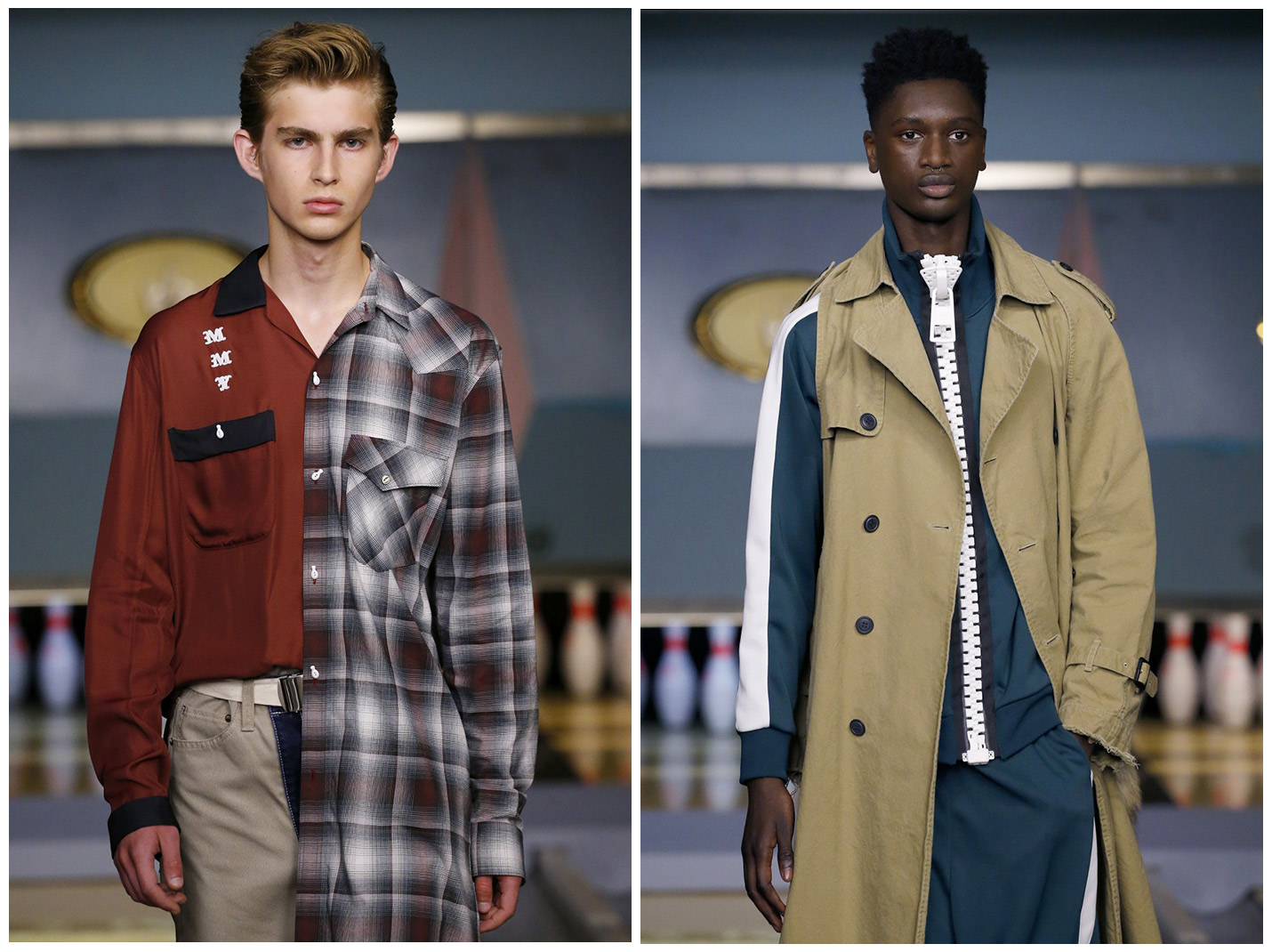 5- Mihara Yasuhiro: Coincide con Liam Hodges en descomponer y recomponer las piezas con tejidos diferentes, un juego de contrastes que quizás hablen de la desustructuración de una sociedad que no tiene claro hacía dónde se dirige. Desorientada, la masa social representada en la pasarela por modelos, juega a los bolos bajo la influencia de la estética americana de los años 50, tras la postguerra. Una década que sin duda marcó el gusto japonés por la moda occidental. Y que aún perdura. Y no podíamos pasar por alto el detalle, más detallazo, de las cremalleras gigantes. Una colaboración de Mihara Yasuhiro con la empresa japonesa YKK, el mayor fabricante de cremalleras del mundo. De hecho los nipones son los amos del mercado. Fabrican la mitad de las cremalleras del mundo. Si estás pensando en montar un negocio, quizás no sea mala idea una fábrica de cremalleras.