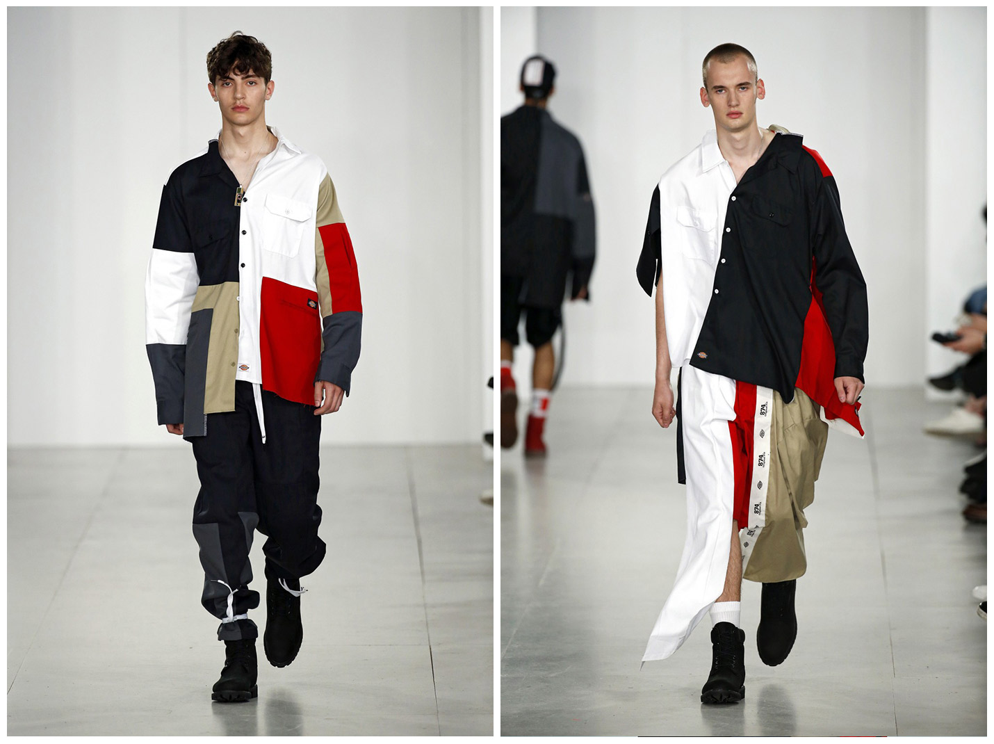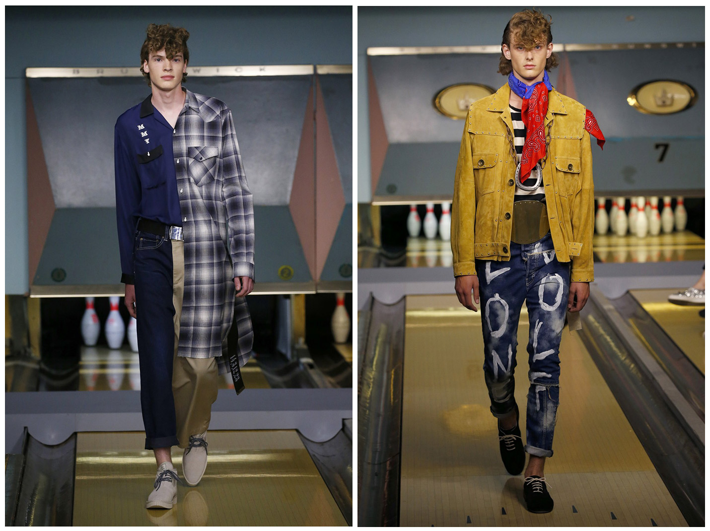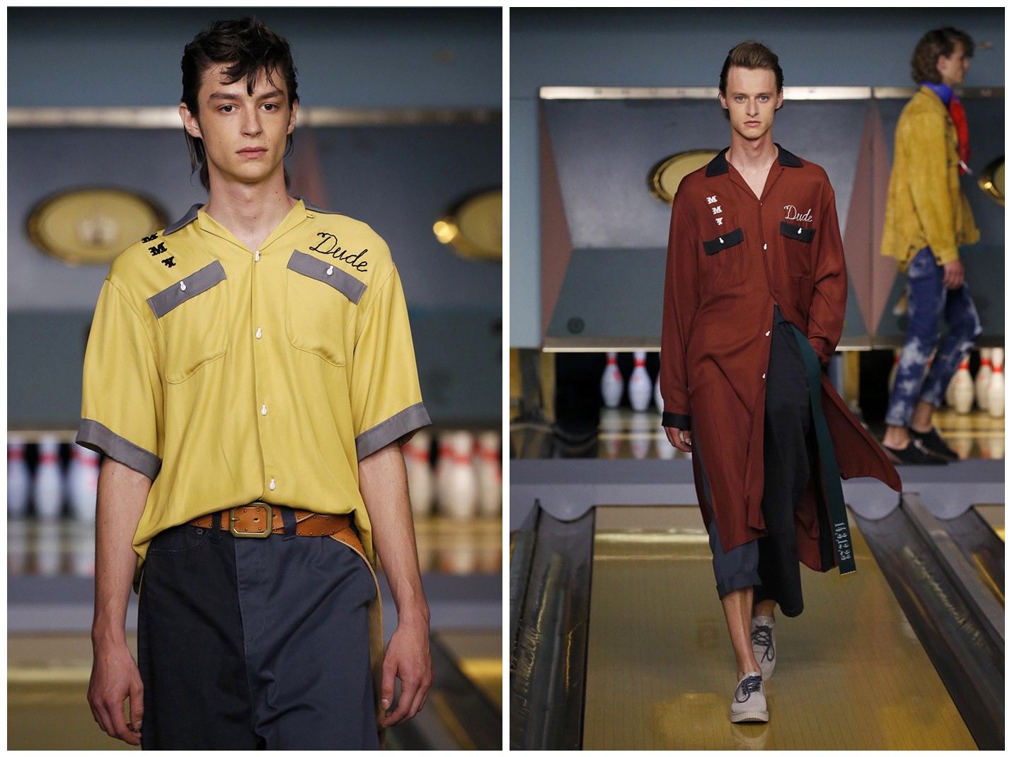5- Mihara Yasuhiro: Coincide con Liam Hodges en descomponer y recomponer las piezas con tejidos diferentes, un juego de contrastes que quizás hablen de la desustructuración de una sociedad que no tiene claro hacía dónde se dirige. Desorientada, la masa social representada en la pasarela por modelos, juega a los bolos bajo la influencia de la estética americana de los años 50, tras la postguerra. Una década que sin duda marcó el gusto japonés por la moda occidental. Y que aún perdura. Y no podíamos pasar por alto el detalle, más detallazo, de las cremalleras gigantes. Una colaboración de Mihara Yasuhiro con la empresa japonesa YKK, el mayor fabricante de cremalleras del mundo. De hecho los nipones son los amos del mercado. Fabrican la mitad de las cremalleras del mundo. Si estás pensando en montar un negocio, quizás no sea mala idea una fábrica de cremalleras.