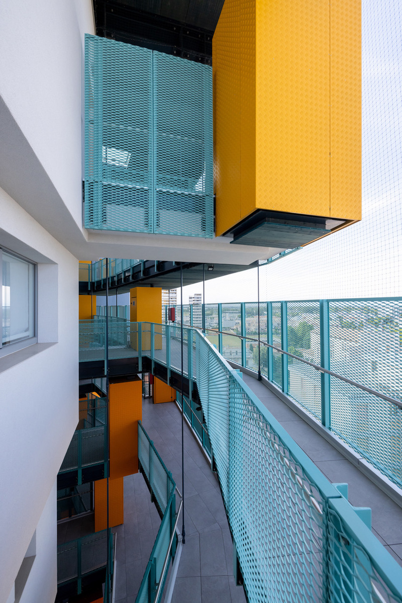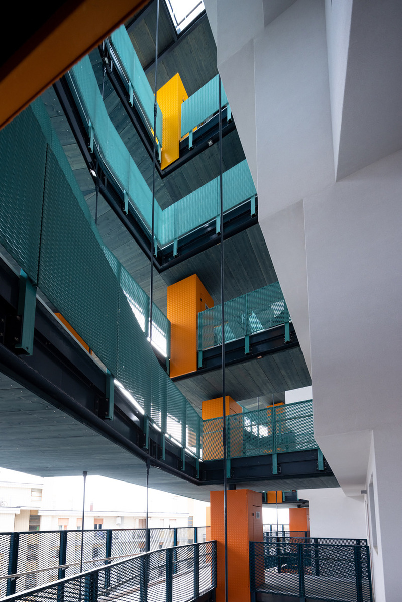 El sistema de distribución de las pasarelas suspendidas y creadas por Stefano Pujatti impone una visión impactante del edificio para los visitantes que vienen del norte. Es una imagen inesperada, donde el color y la materia juegan un papel importante en la percepción de este nuevo organismo arquitectónico.