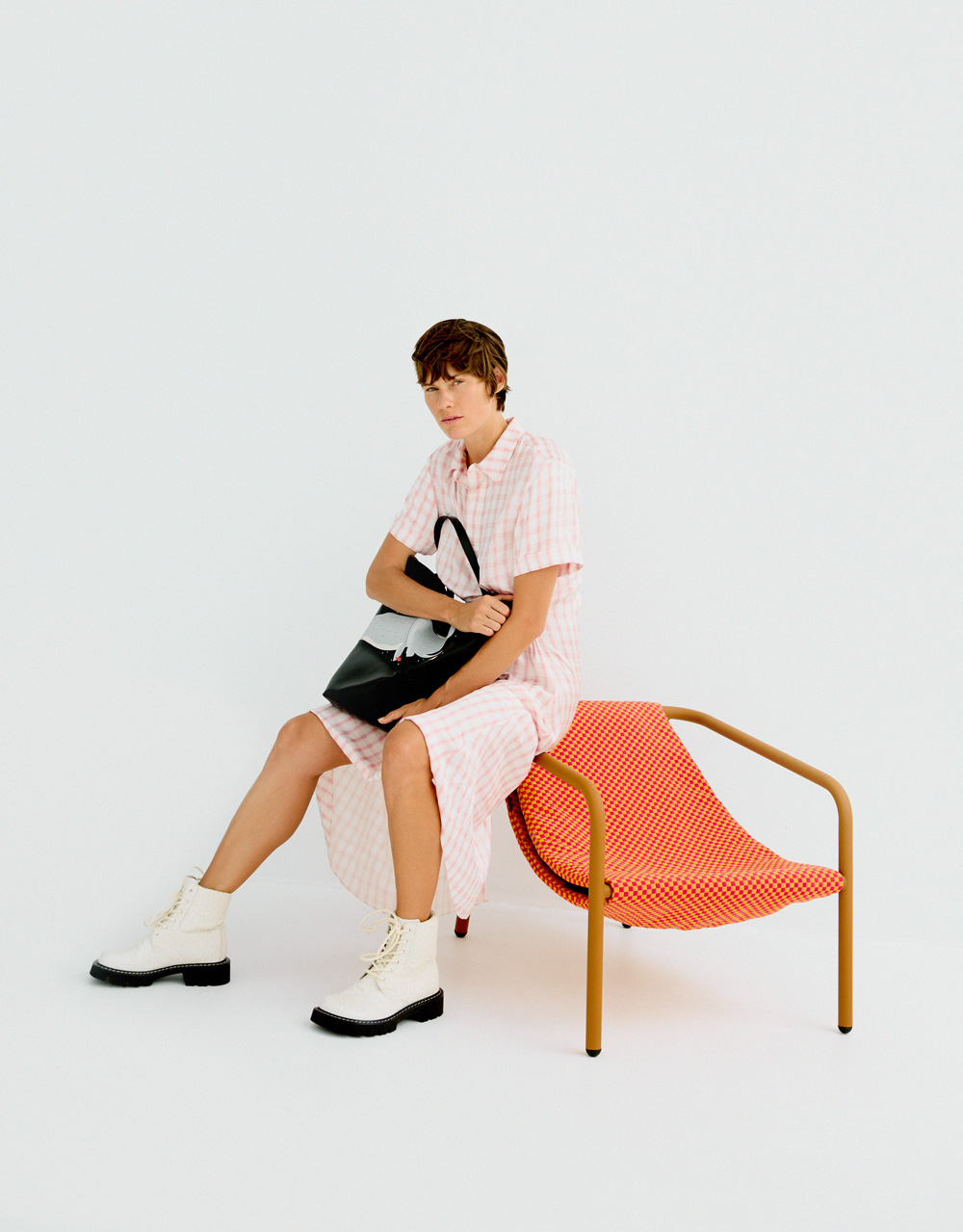 Total look LOEWE: vestido polo en seda + bota sierra combat en piel + Bolso Puzzle fold tote large ballena en piel / Butaca Elle Mini diseñada por Rafa García para SANCAL