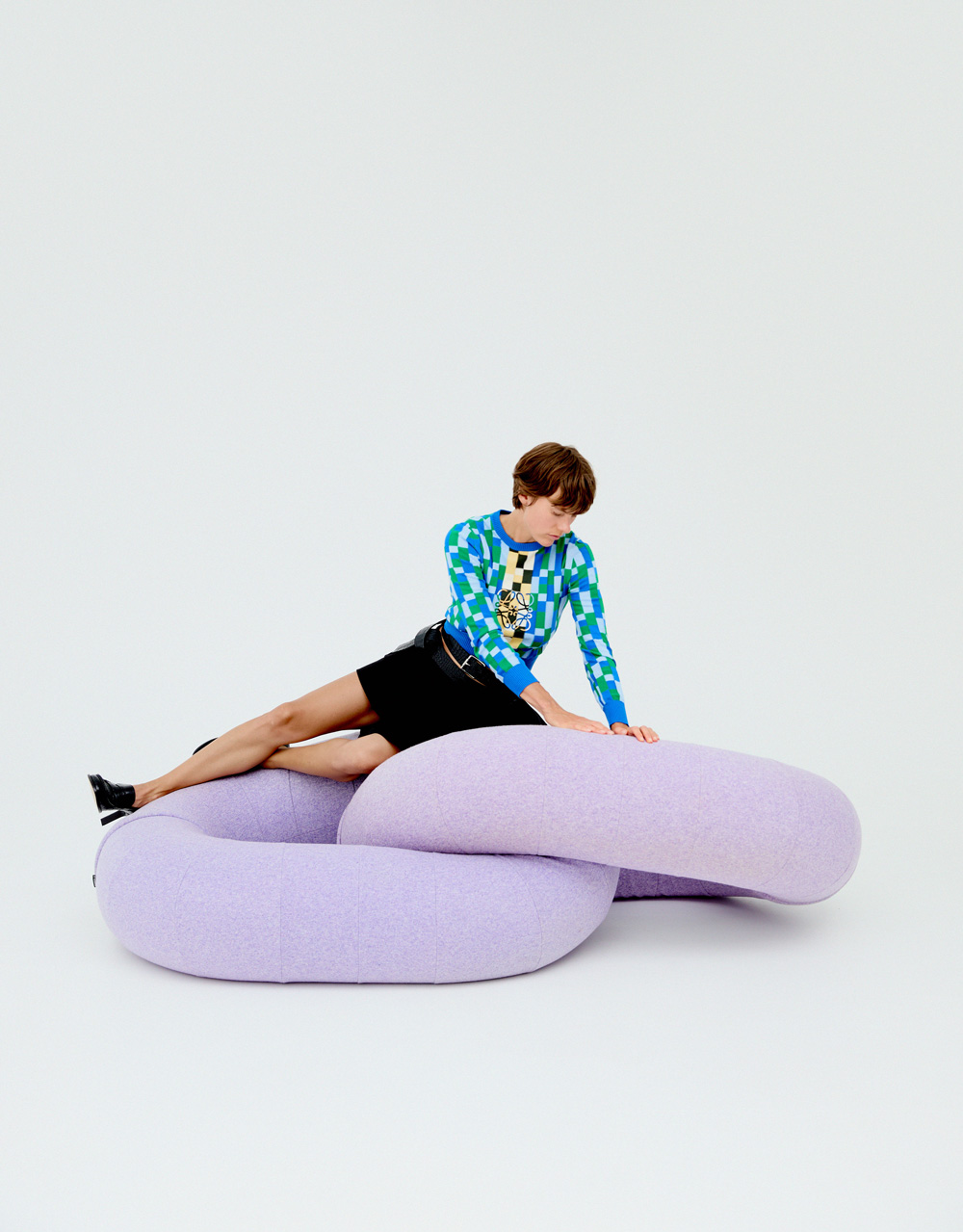 Total look LOEWE: anagram + sweater en algodón + mini falda + cinturón en algodón + mocasín campo en piel de ternera Pouf Link diseñado por Raw Color para SANCAL
