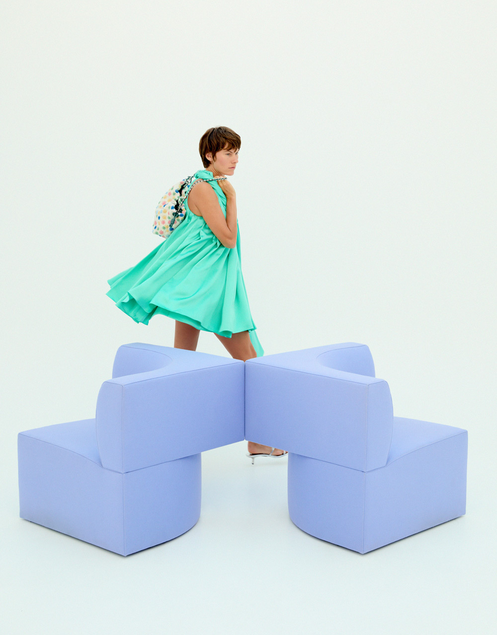 Total look LOEWE: vestido trapeze en seda + sandalia petal 45 en piel met.lica + bolso Flamenco Purse en piel con cuentas / Sofá modular Canto diseñado por Mut Design para SANCAL